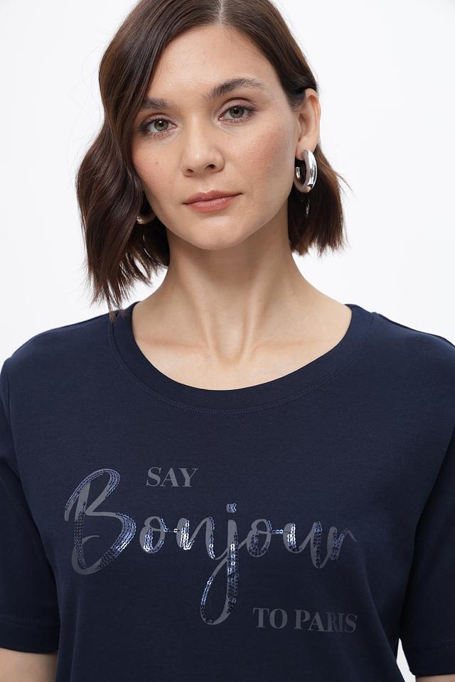 Основной цвет футболки – насыщенный синий. Передняя часть украшена стильным принтом с надписью "Bonjour to Paris", выполненным в серебристых тонах. Принт добавляет образу легкость и непринужденность.