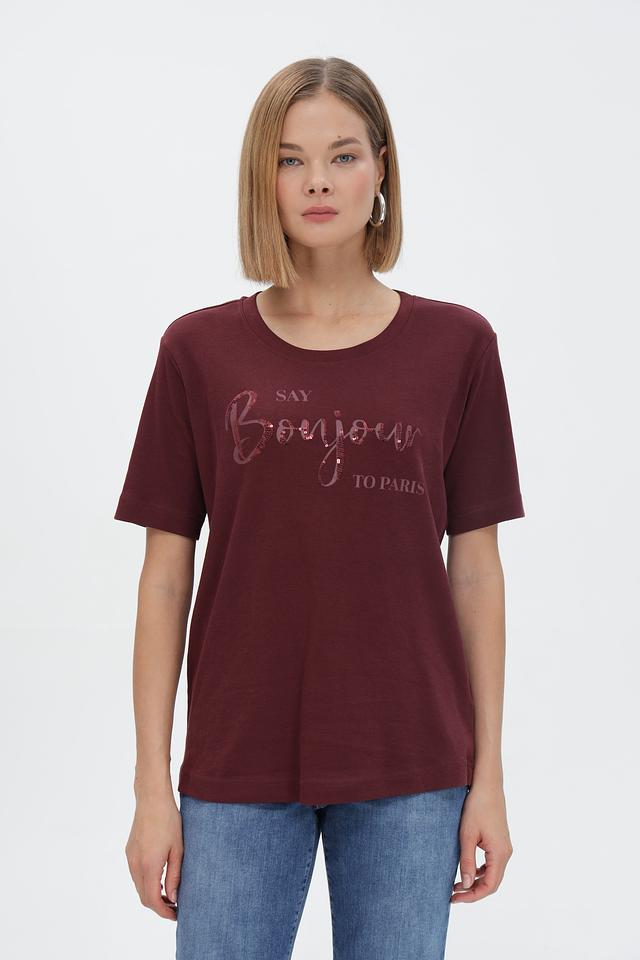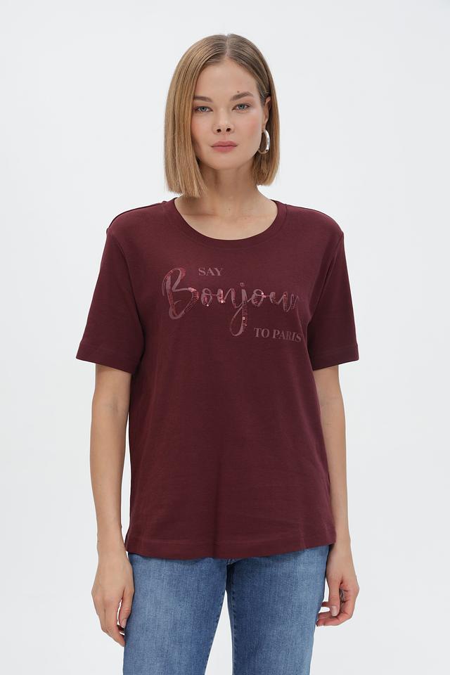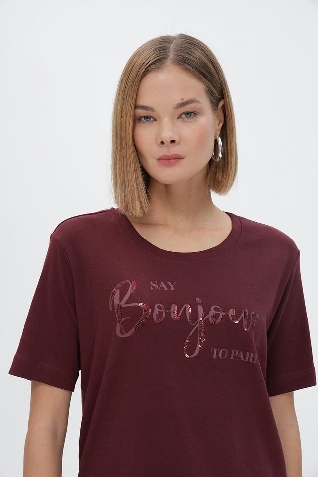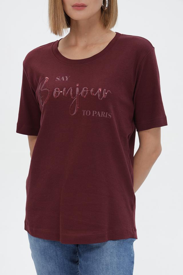 Модель оформлена круглым вырезом горловины и короткими рукавами. Центральным элементом дизайна является яркий принт с надписью «Bonjour to Paris», выполненный в бордовом цвете в тон изделию, что придает футболке стильный и современный вид.