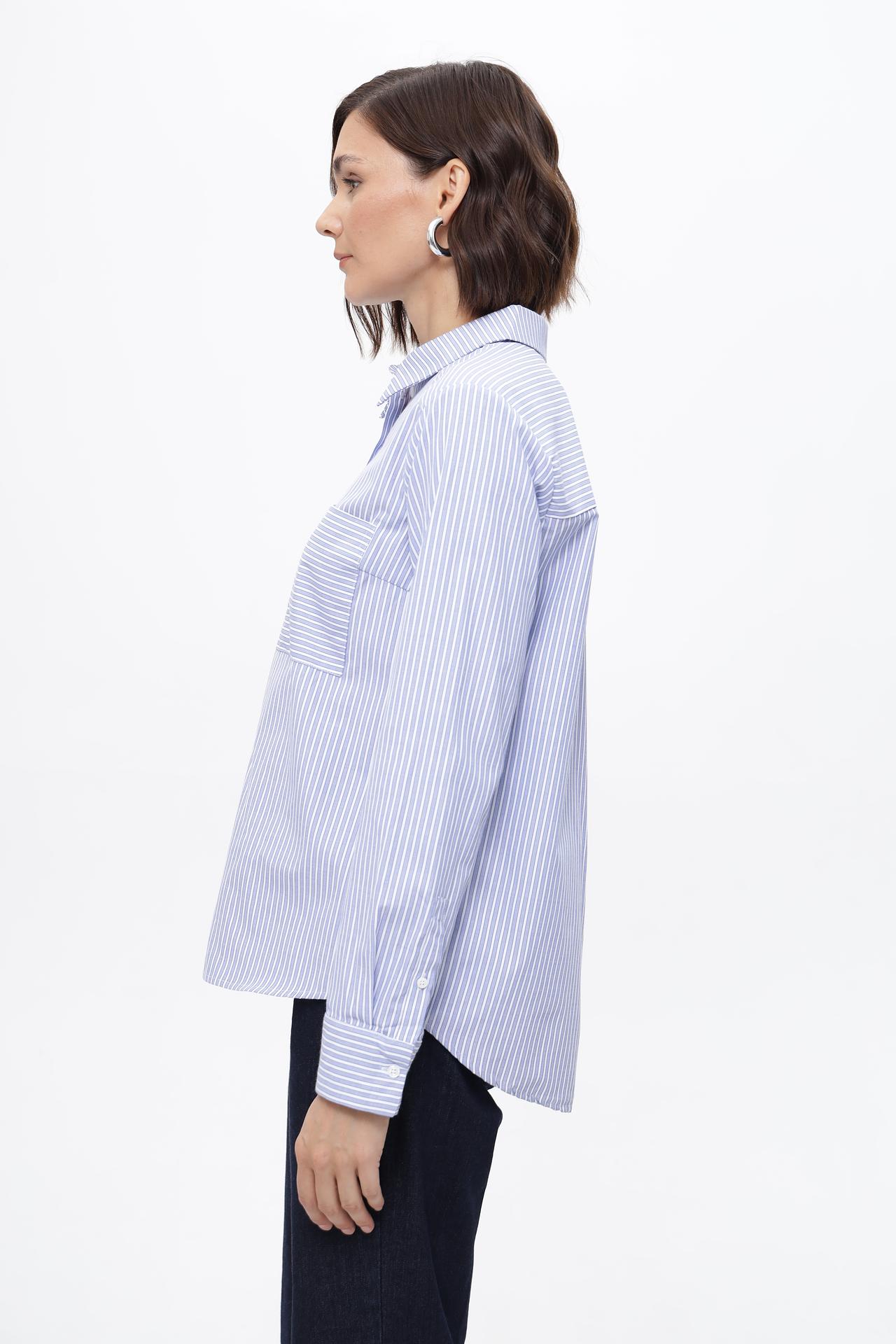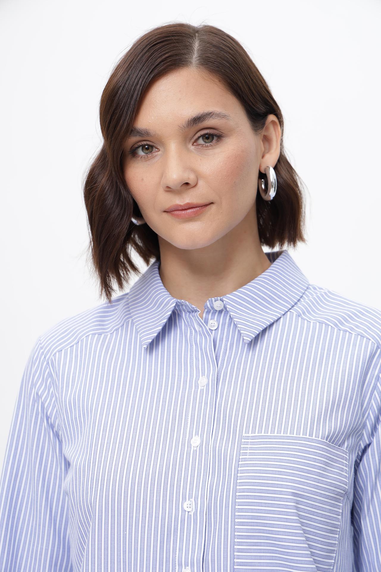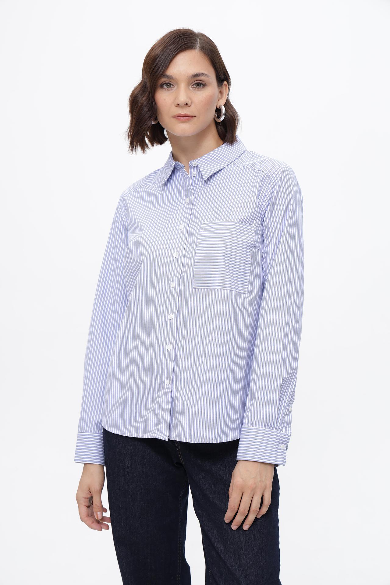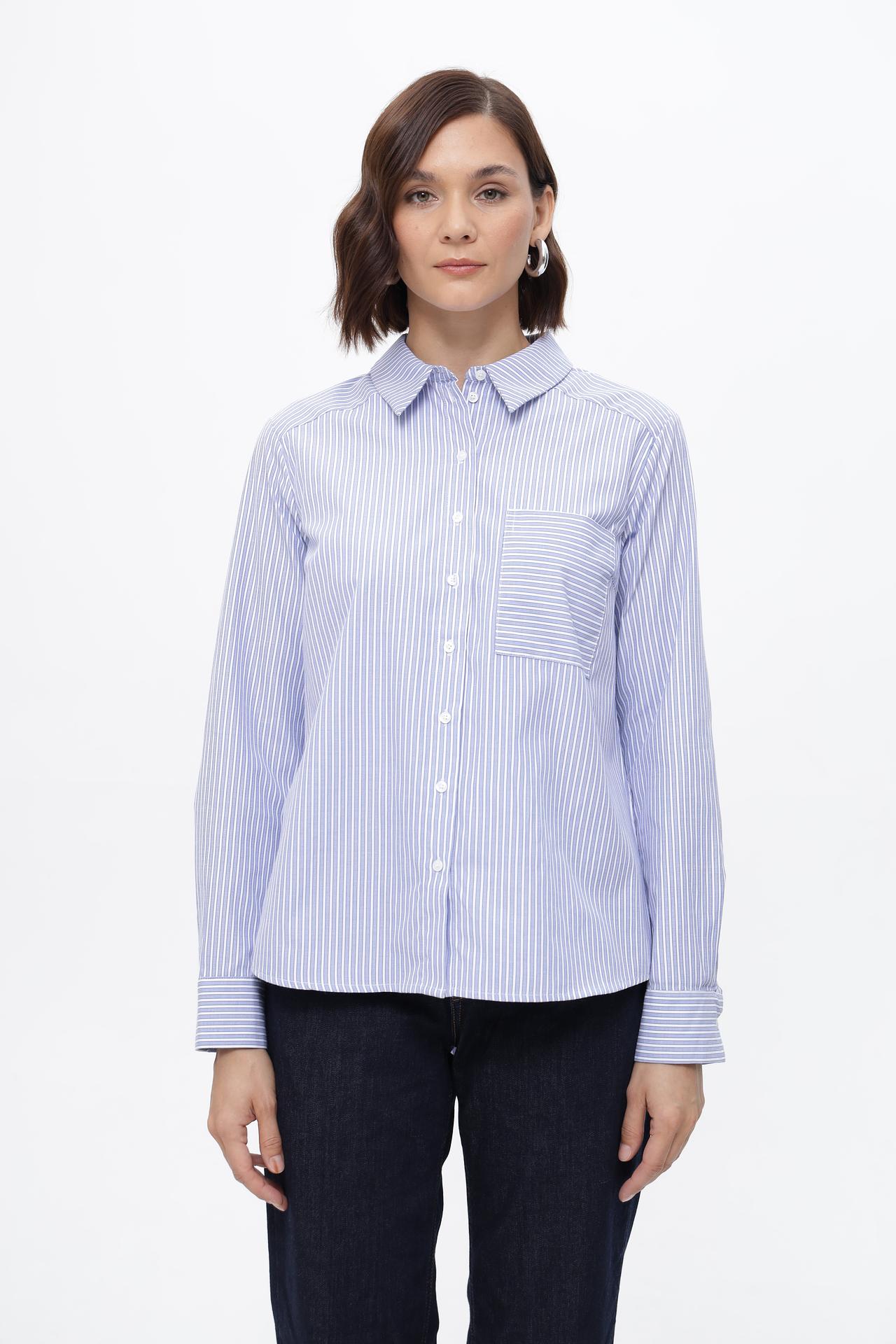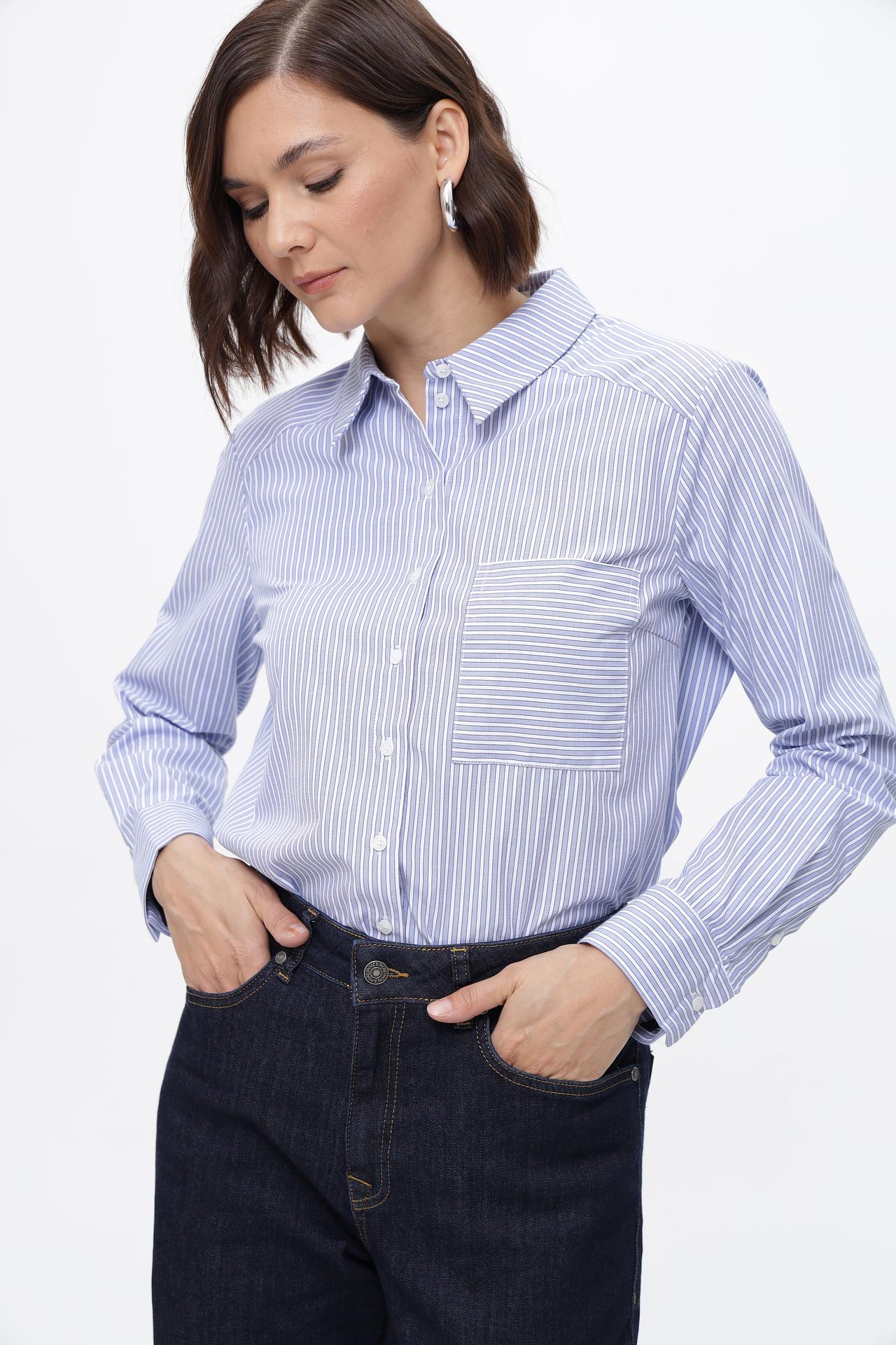 - Дизайн: Классический крой блузы с длинным рукавом и отложным воротником. На груди расположен накладной карман, добавляющий функциональности и стиля.