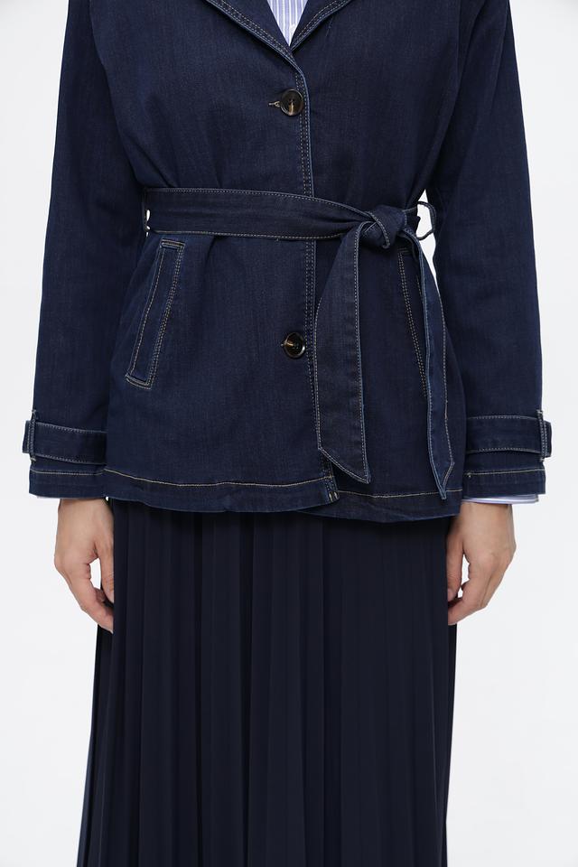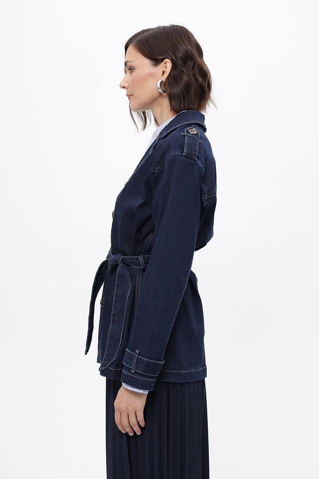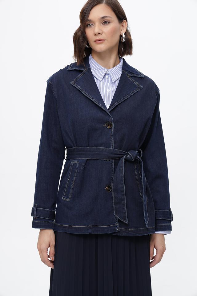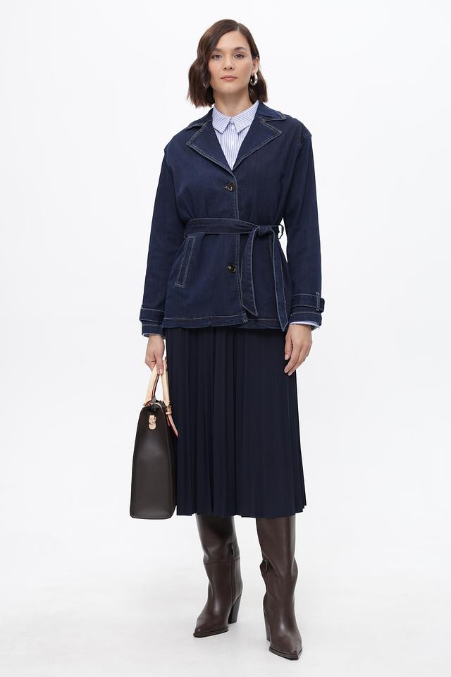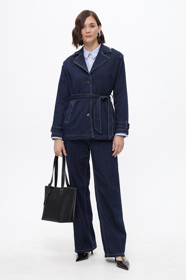 Жакет имеет прямой крой, отложной воротник и застегивается на пуговицы. Особенности модели - накладные карманы и пояс, который можно завязать на талии, чтобы подчеркнуть фигуру.