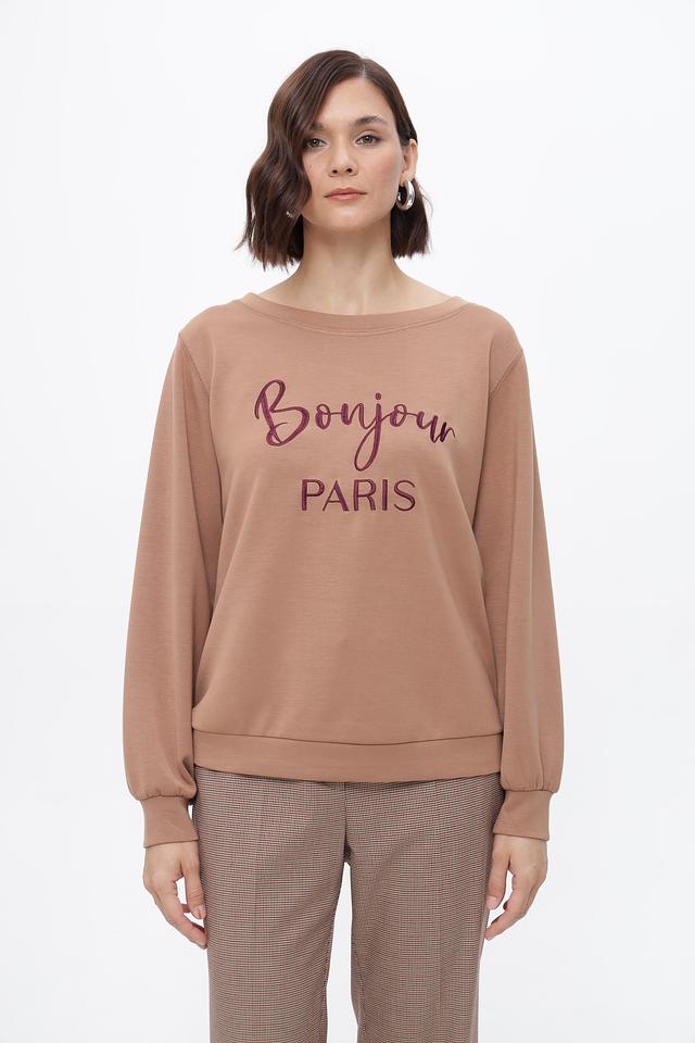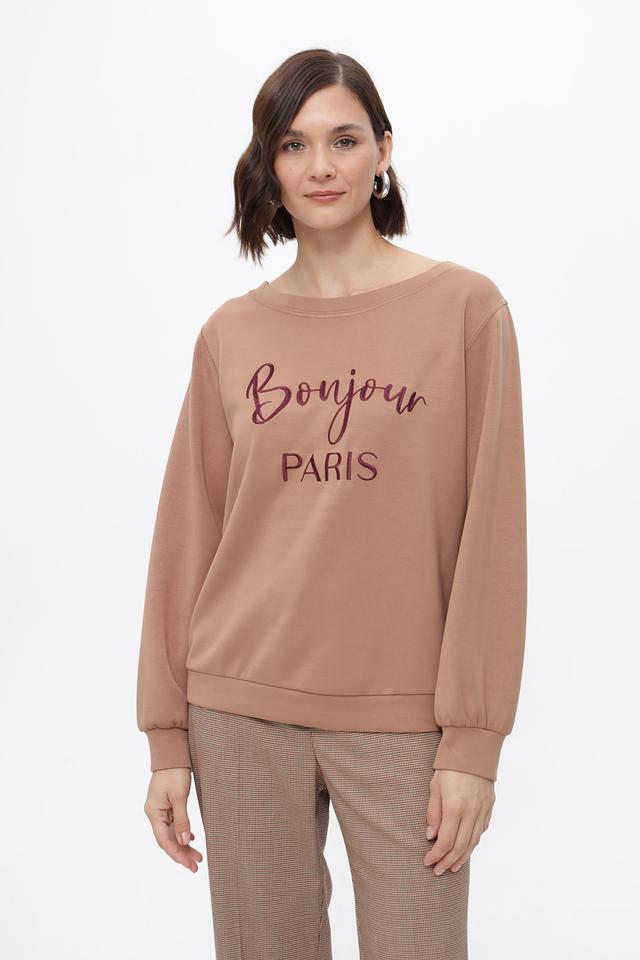 Бежевый пуловер Steilmann с принтом «Bonjour Paris» — стильная и комфортная модель на каждый день. Изготовлен из мягкого модала с добавлением полиэстера и эластана для удобства носки. Состав: модал 65%, полиэстер 30%, эластан 5%