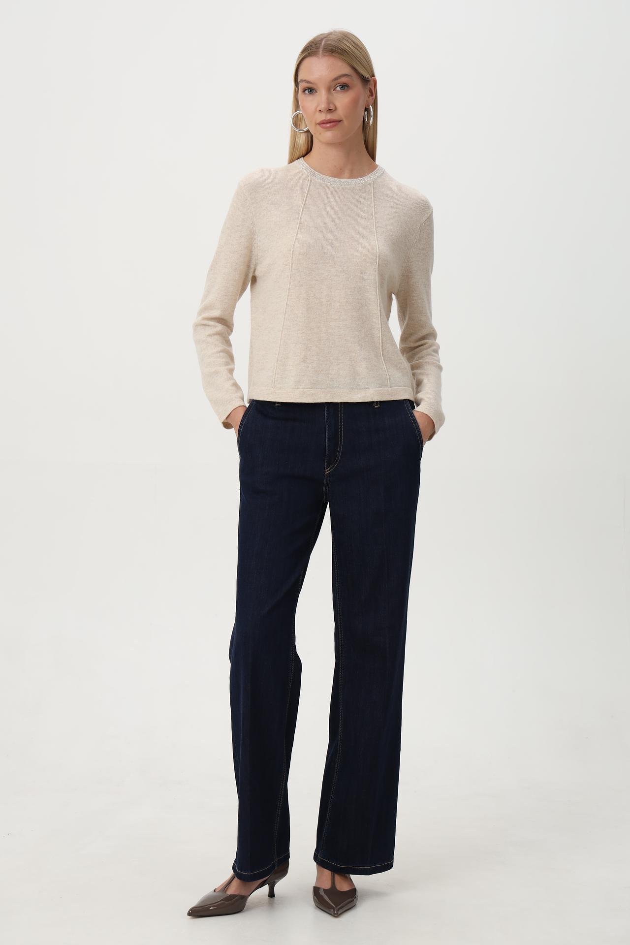 - Крой: Прямой крой со слегка расклешенными штанинами. Такой фасон визуально удлиняет ноги и создает элегантный силуэт. Высокая посадка обеспечивает комфорт и идеальное прилегание.