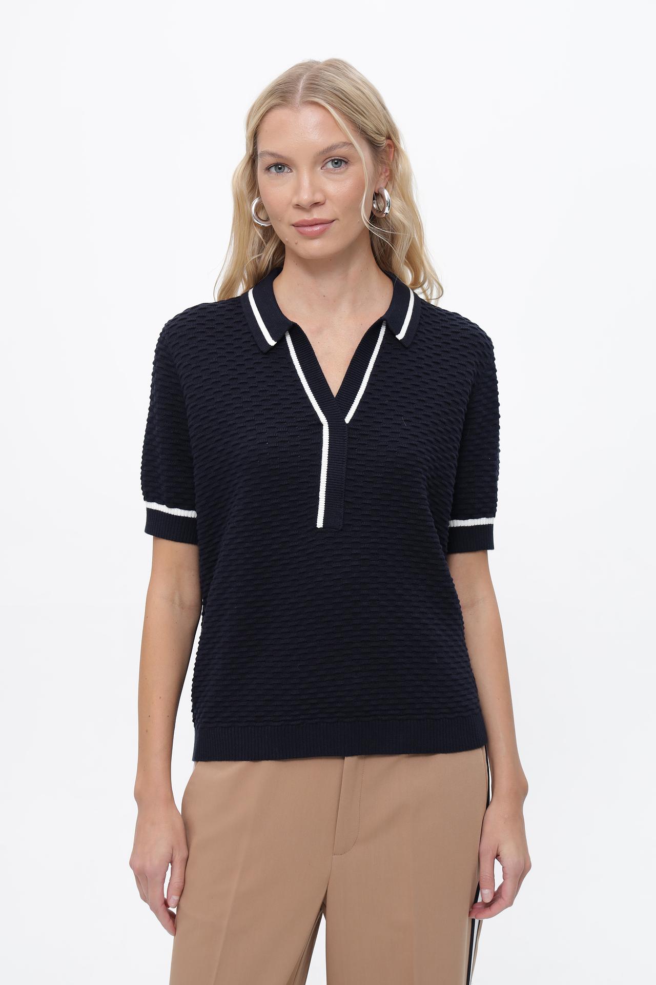 Пуловер отличается классическим темно-синим цветом и имеет стильную контрастную белую отделку по воротнику-поло и манжетам. Рельефная текстура ткани придает изделию оригинальность и глубину.
