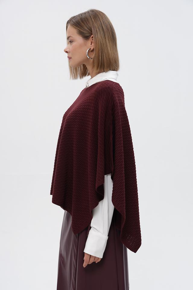 Модель выполнена из мягкого трикотажа, сочетающего в себе 50% хлопка и 50% полиакрила. Фактурная вязка придает изделию объем и оригинальность. Пончо имеет свободный крой и широкие рукава, обеспечивающие комфортную посадку по фигуре.