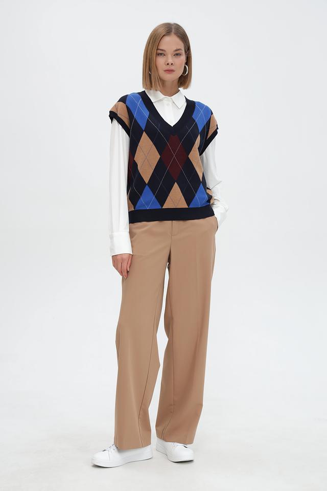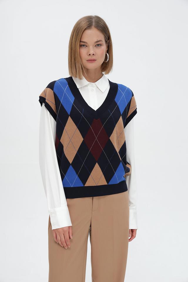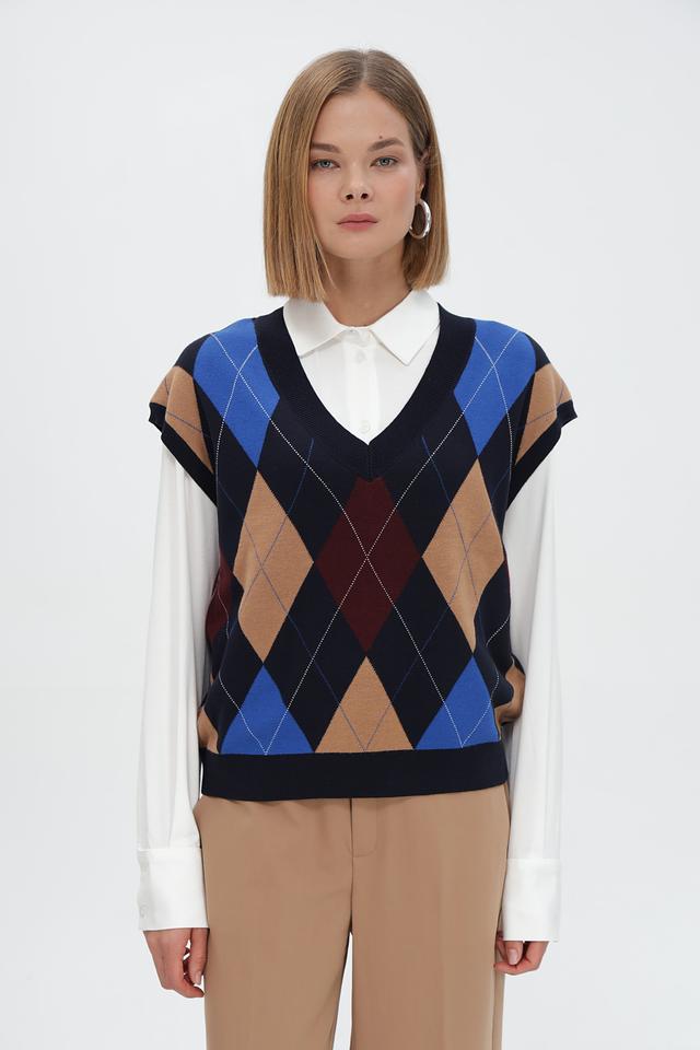 Женский жилет Steilmann – это универсальный предмет гардероба, который добавит изысканности и стиля любому образу. Жилет выполнен в синем цвете и украшен классическим ромбовидным узором в бежевых, коричневых и бордовых оттенках.