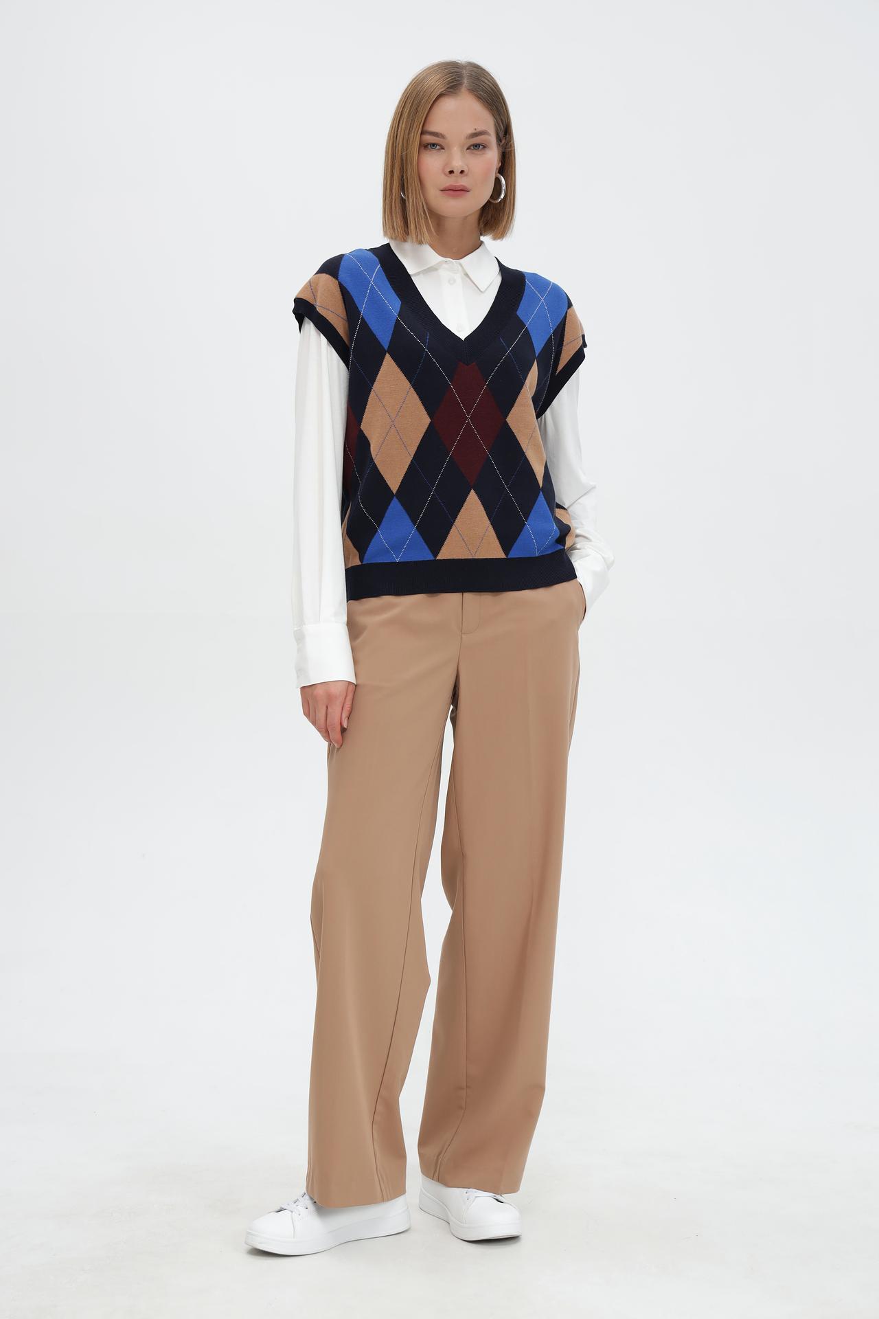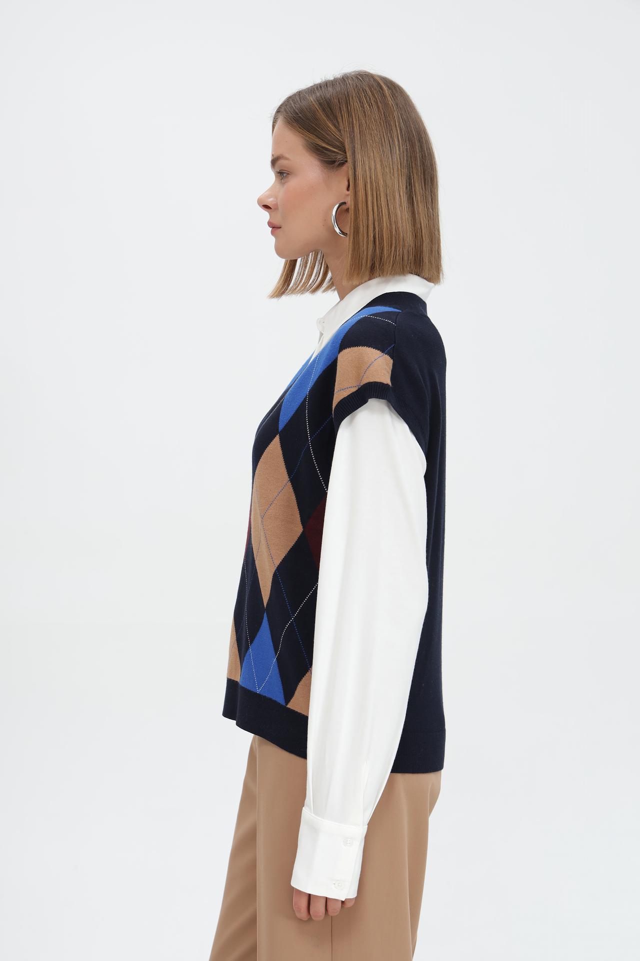 - Дизайн: Классический V-образный вырез и безрукавный крой делают жилет универсальным элементом одежды. Оригинальный узор "ромбы" в контрастных тонах придает изделию особый шарм и актуальность.