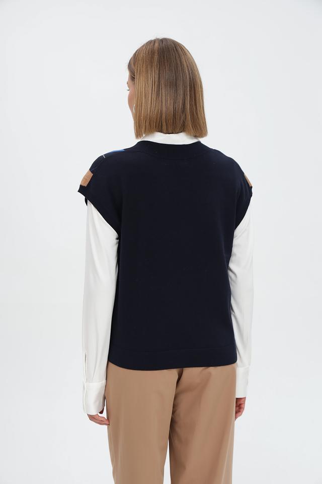Модель имеет V-образный вырез и прямой крой, что делает её подходящей для различных типов фигур. Жилет можно носить как самостоятельный элемент одежды, так и в сочетании с рубашками, блузками или топами.