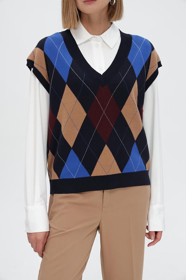 Стильный женский жилет Steilmann синего цвета с классическим ромбовидным узором. Изготовлен из мягкого сочетания хлопка и полиакрила, обеспечивающего комфорт и удобство в носке. Состав: хлопок 50%, полиакрил 50%