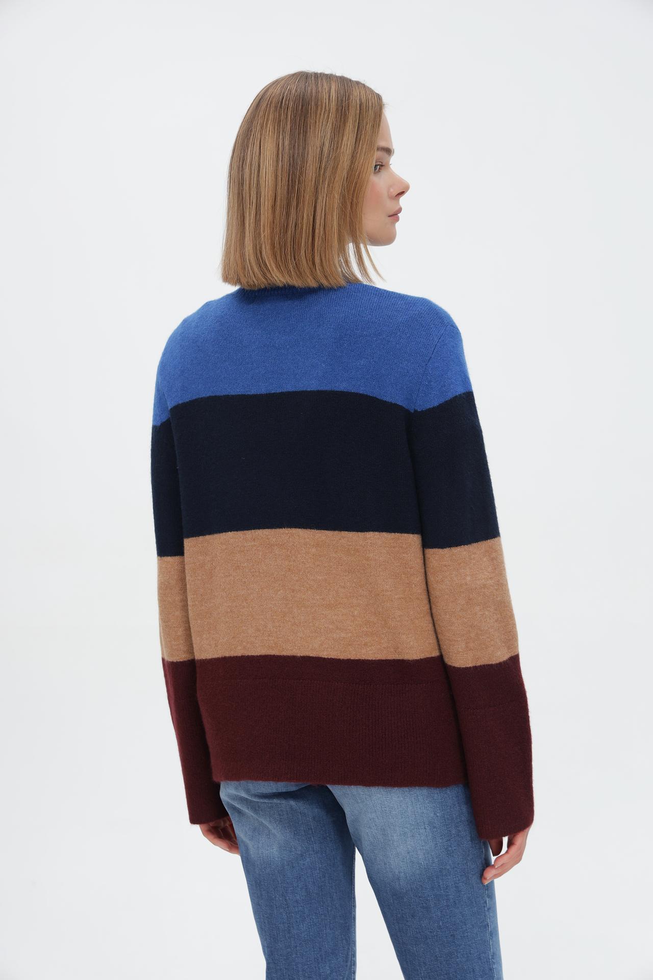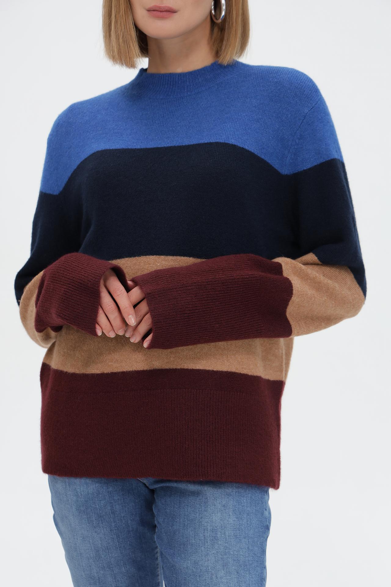 - Дизайн: Контрастные горизонтальные полосы в синих, темно-синих, бежевых и бордовых тонах создают динамичный и модный образ. Высокий воротник-стойка добавляет изысканности.