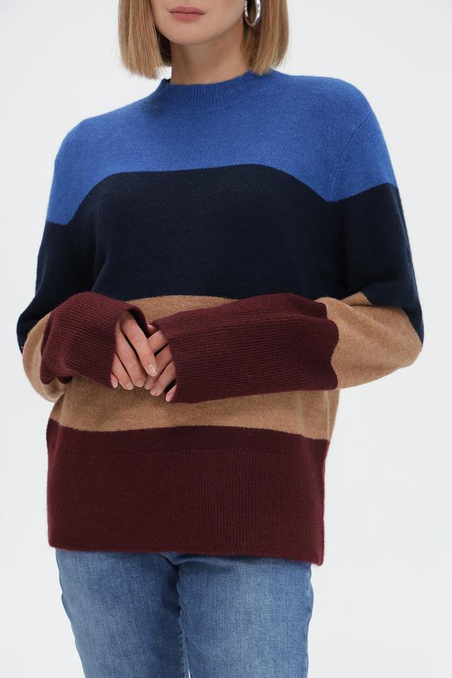 Модель выполнена в оригинальной цветовой гамме с горизонтальными полосами синего, коричневого, бежевого и бордового цветов. Высокий воротник-водолазка придаёт изделию элегантный вид.