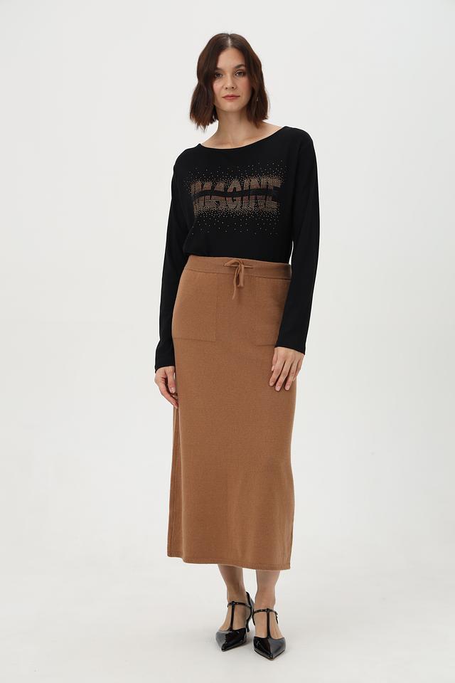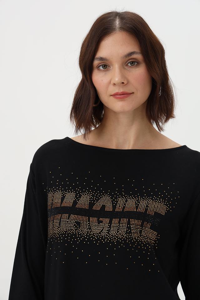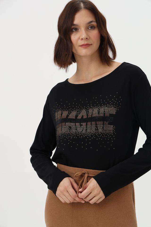 Лонгслив имеет классический крой с длинными рукавами и круглым вырезом горловины. Особое внимание привлекает декор из мелких страз, образующих графичный узор на передней части изделия. Этот элемент придает образу изысканность и блеск.