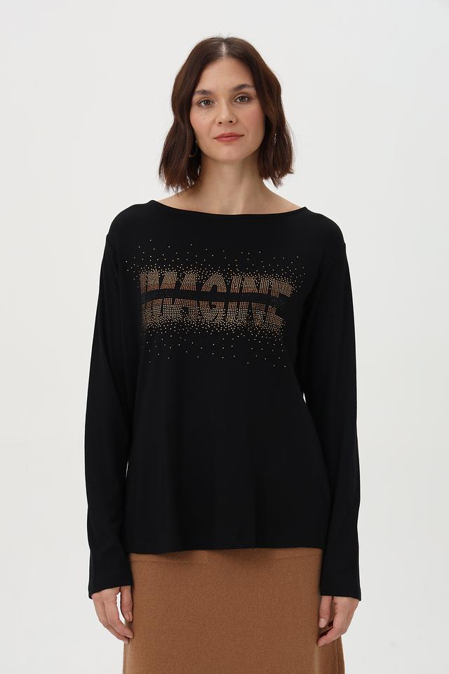 Чёрный лонгслив от Steilmann с длинными рукавами, украшенный мерцающим декором из страз. Изготовлен из мягкого хлопка с модалом для комфорта и приятных ощущений. Идеально дополнит повседневный образ. Состав: хлопок 50%, модал 50%