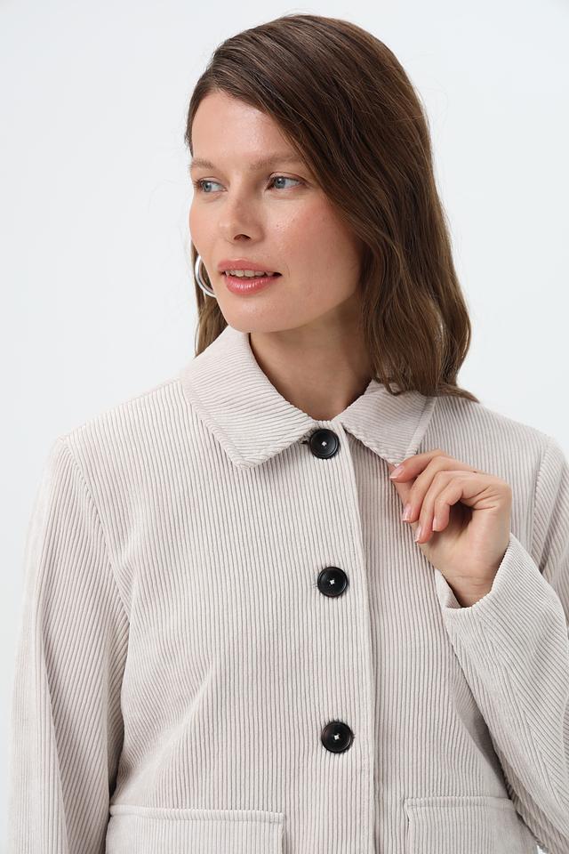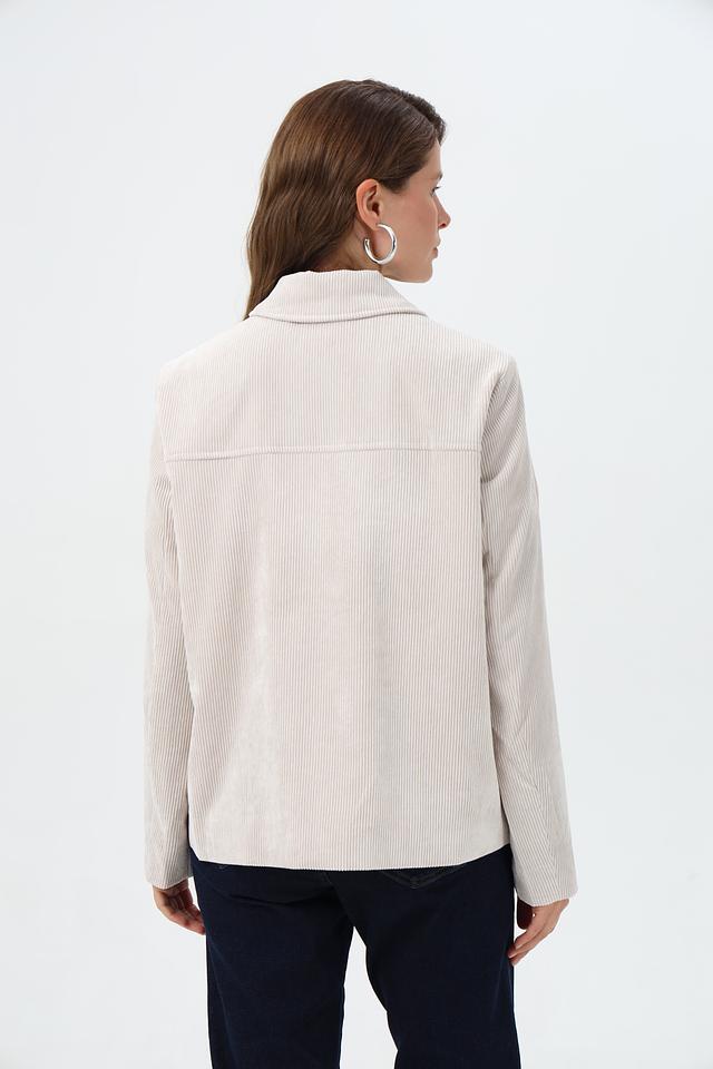 Жакет имеет классический крой с длинными рукавами и отложным воротником. Застежка на пуговицы в тон изделия. На передней части расположены накладные карманы.