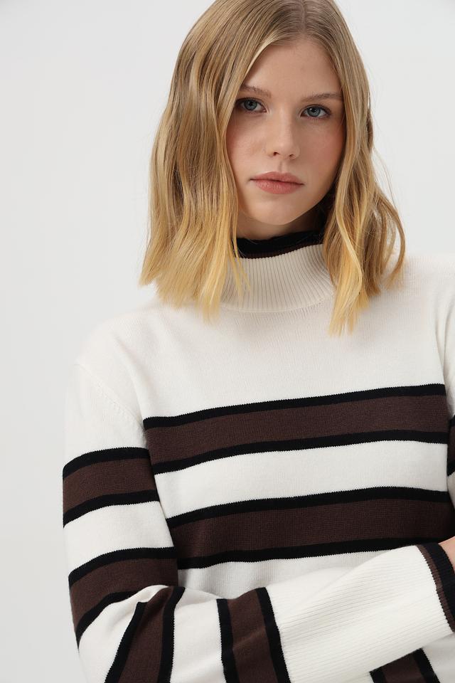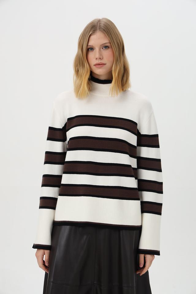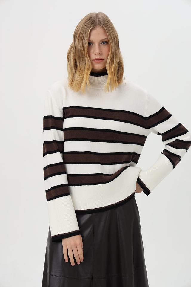 Представляем стильный пуловер от бренда Steilmann. Модель выполнена в белом цвете с горизонтальными полосами чёрного и коричневого оттенков, что придает ей актуальный вид.
