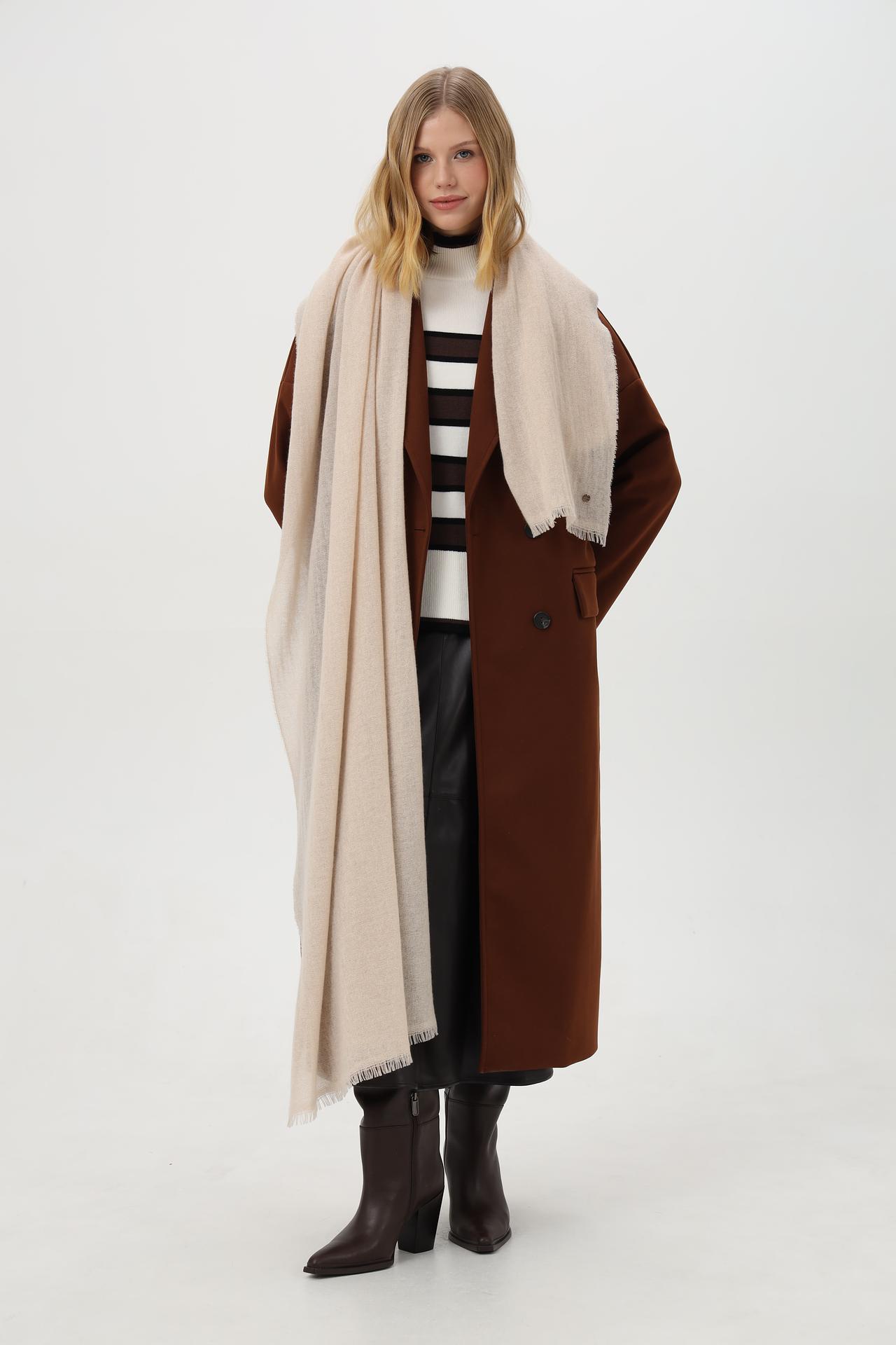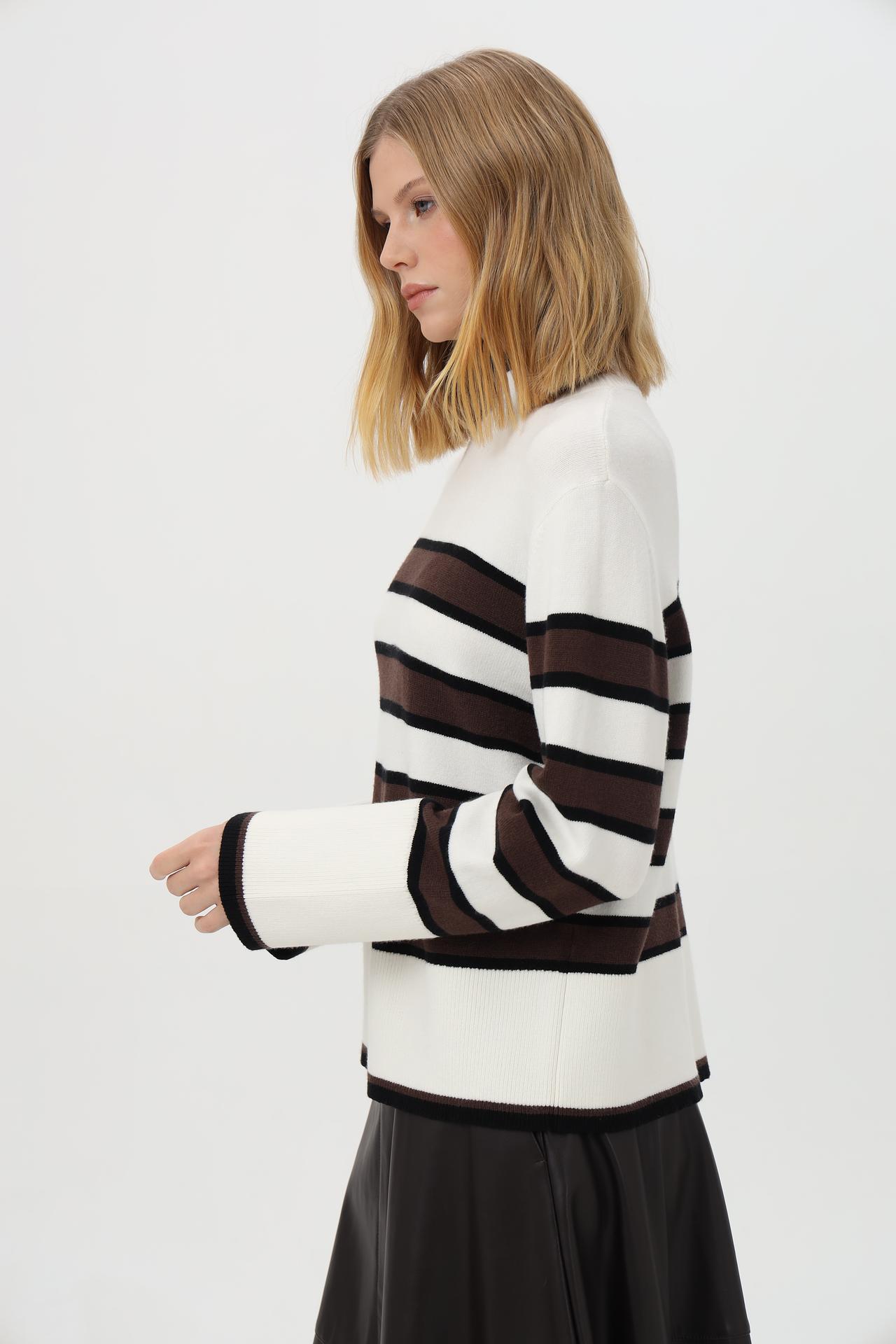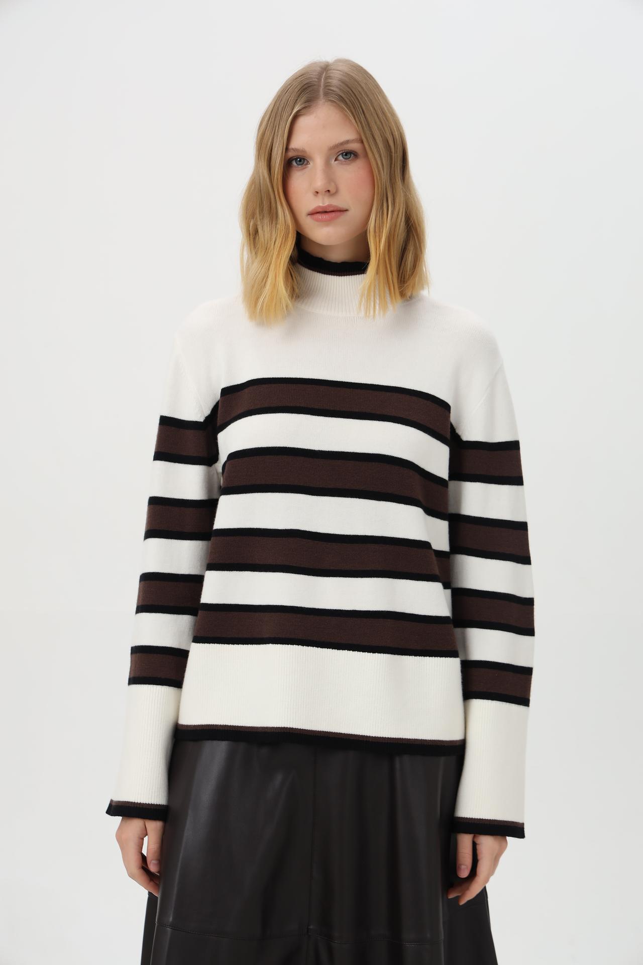 Модель выполнена в классическом дизайне в полоску, сочетающем белый, коричневый и черный цвета. Высокий воротник-гольф добавляет образу утонченности и обеспечивает дополнительное тепло.