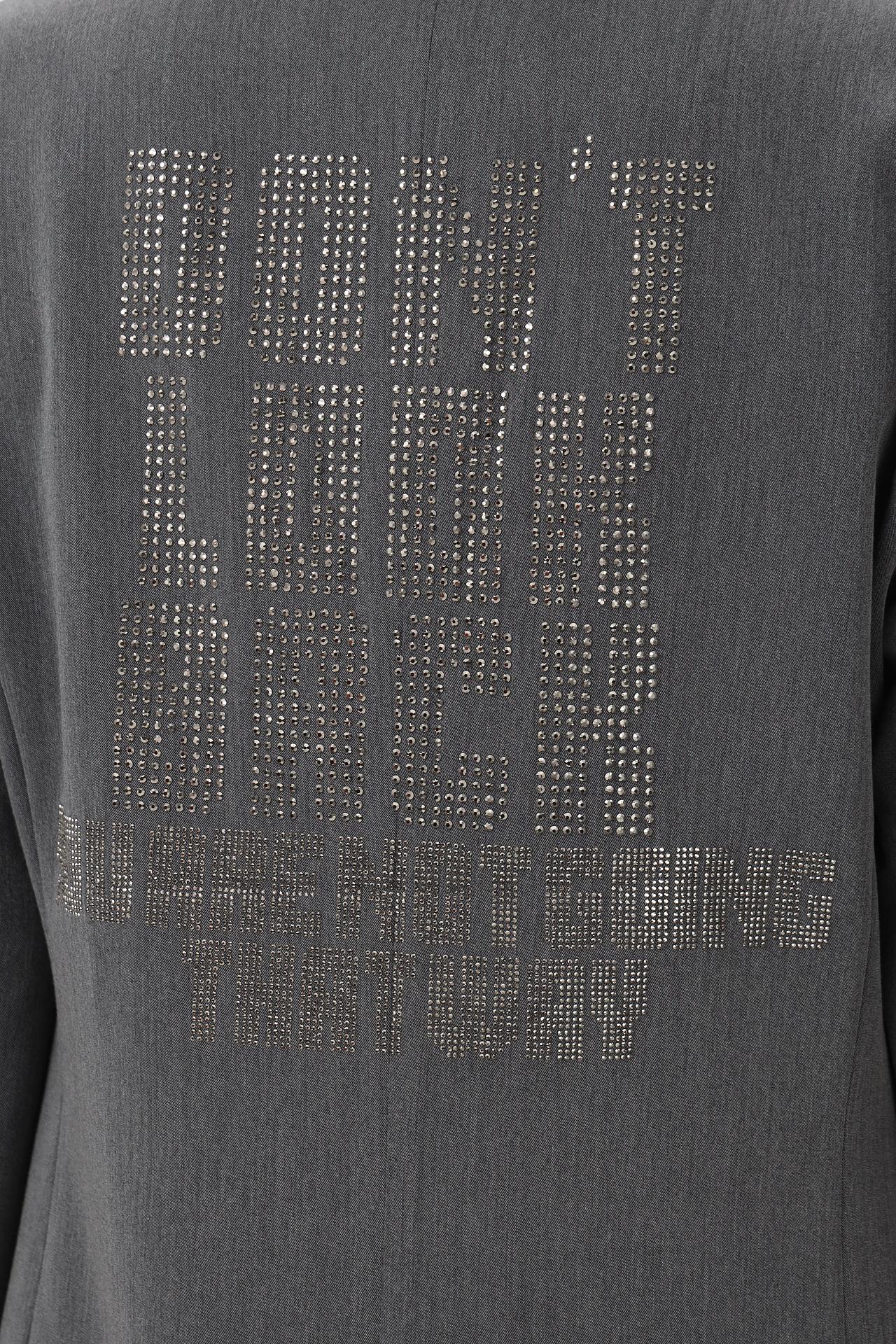 - Принт: Декоративный принт из мерцающих страз на спине с надписью «DON'T LOOK BACK, SOMETHING IS GAINING ON YOU» (Не оглядывайся, что-то настигает тебя) добавляет образу дерзости и индивидуальности.
