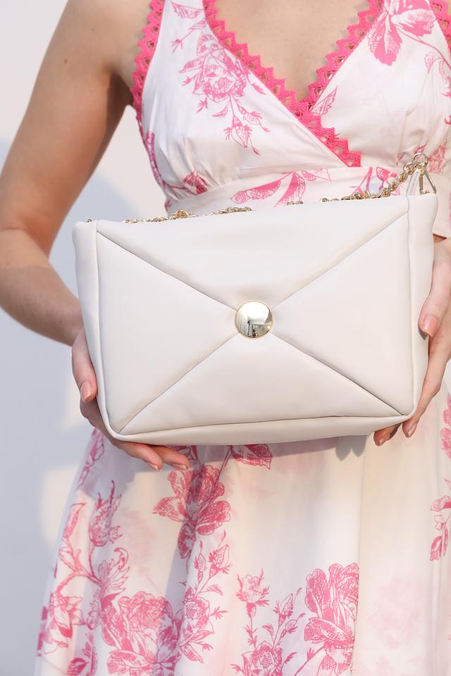 Особенностью данной модели является её необычная форма клапана, украшенного изящной металлической застежкой. Цепочка-ручка позволяет носить сумку на плече или через плечо, обеспечивая комфорт и свободу движений.