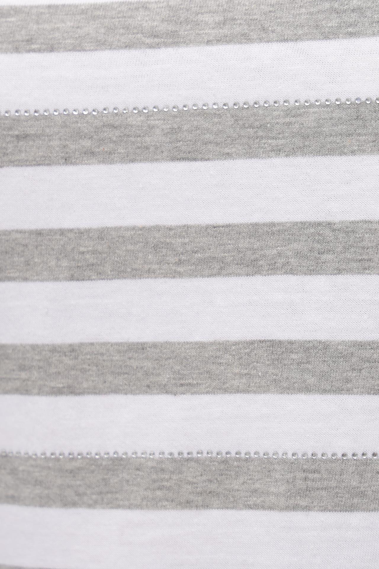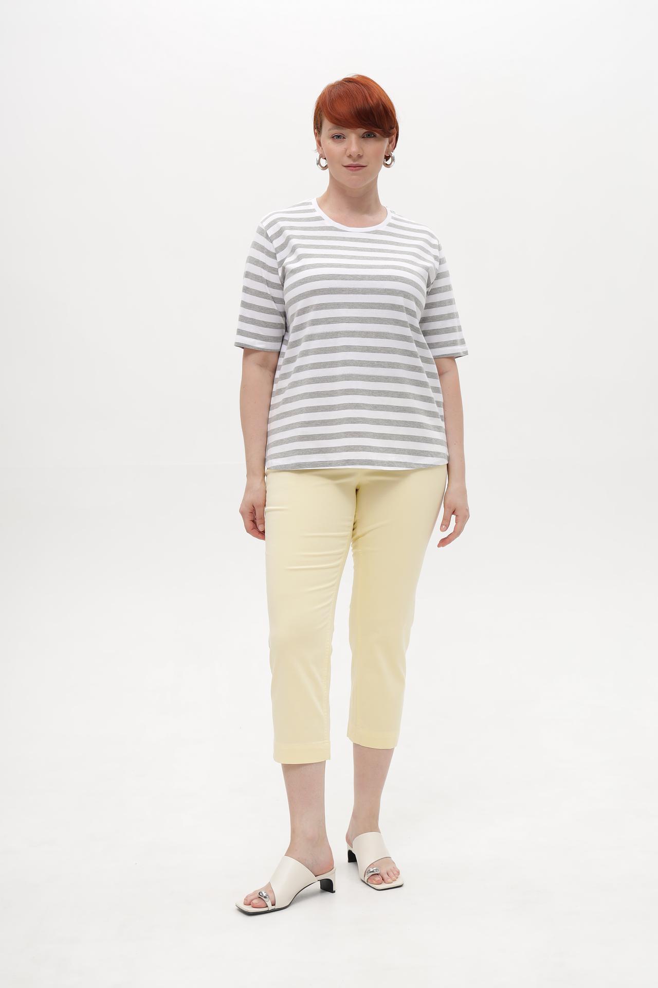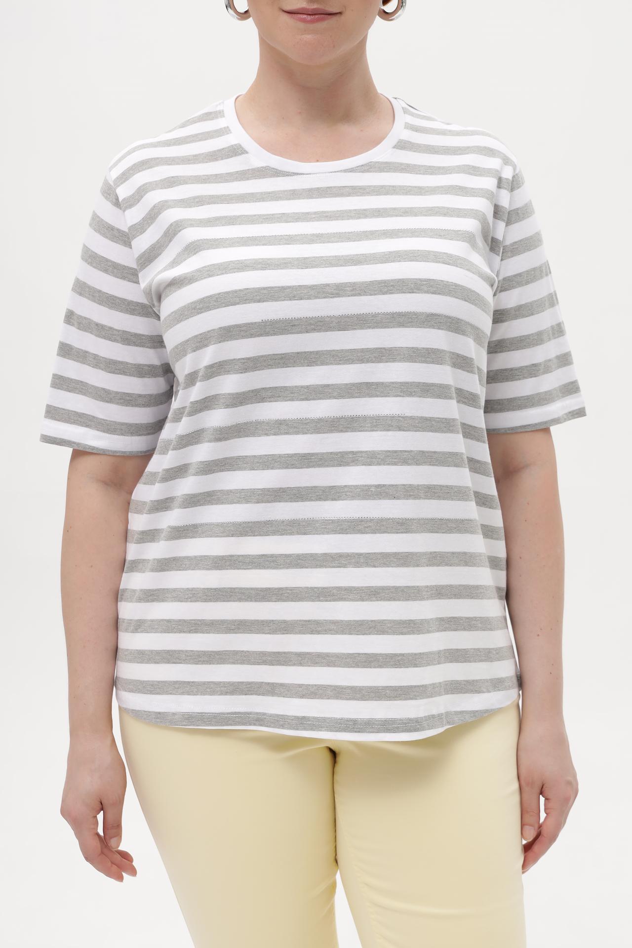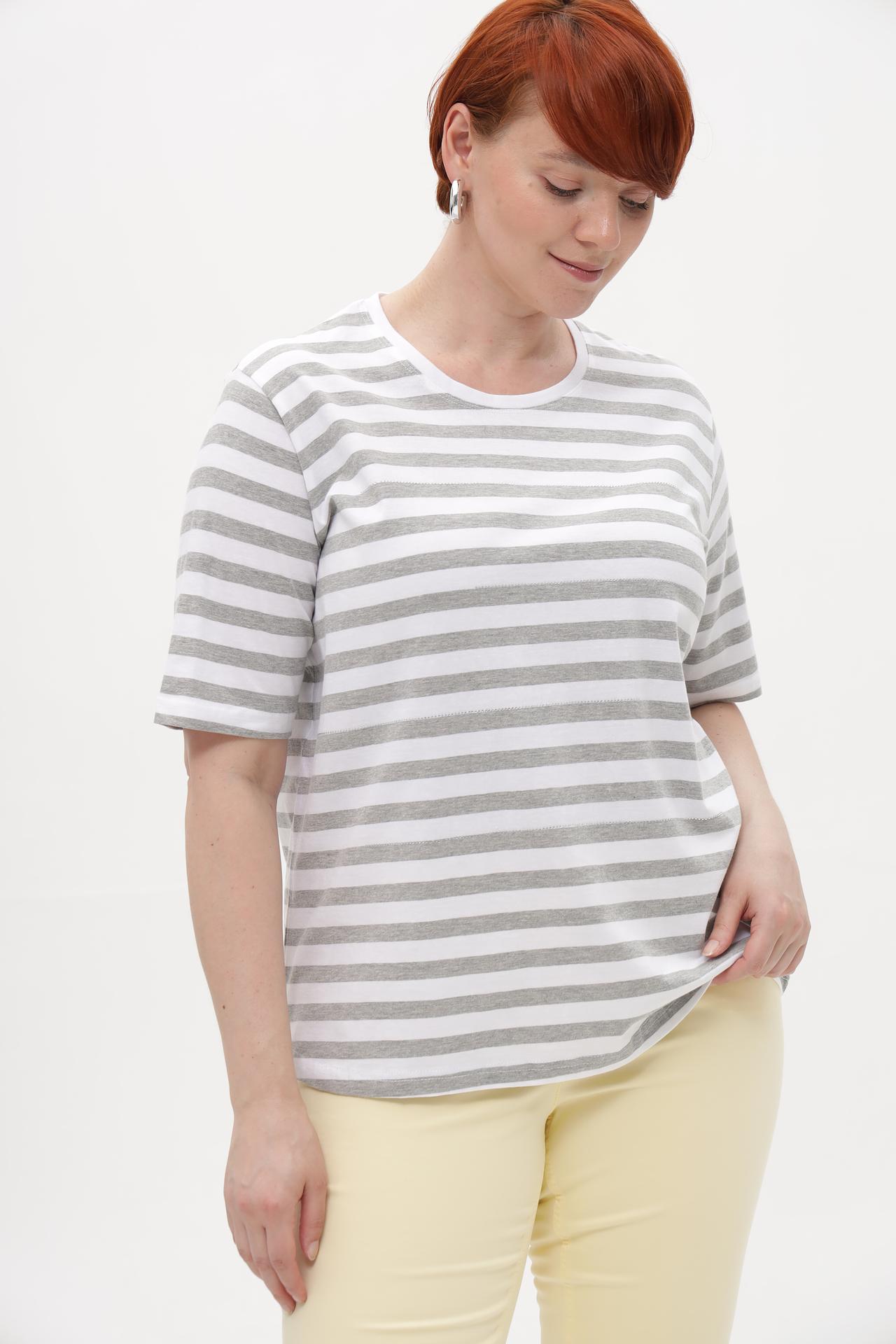 - Дизайн: Классическая модель в горизонтальную полоску серого и белого цветов. Аккуратный круглый вырез горловины и короткие рукава делают футболку универсальной.