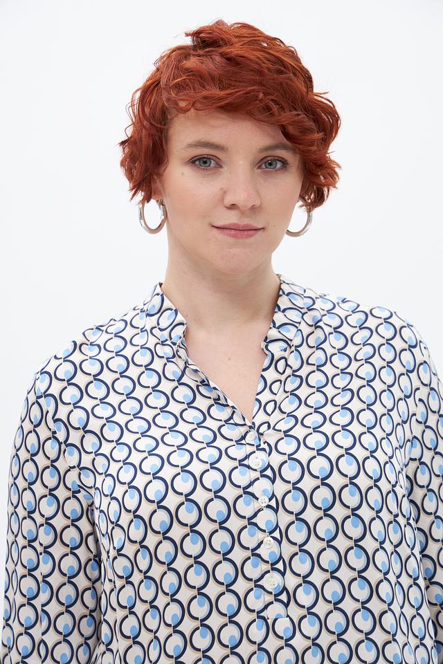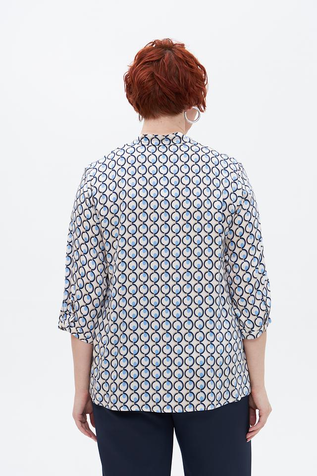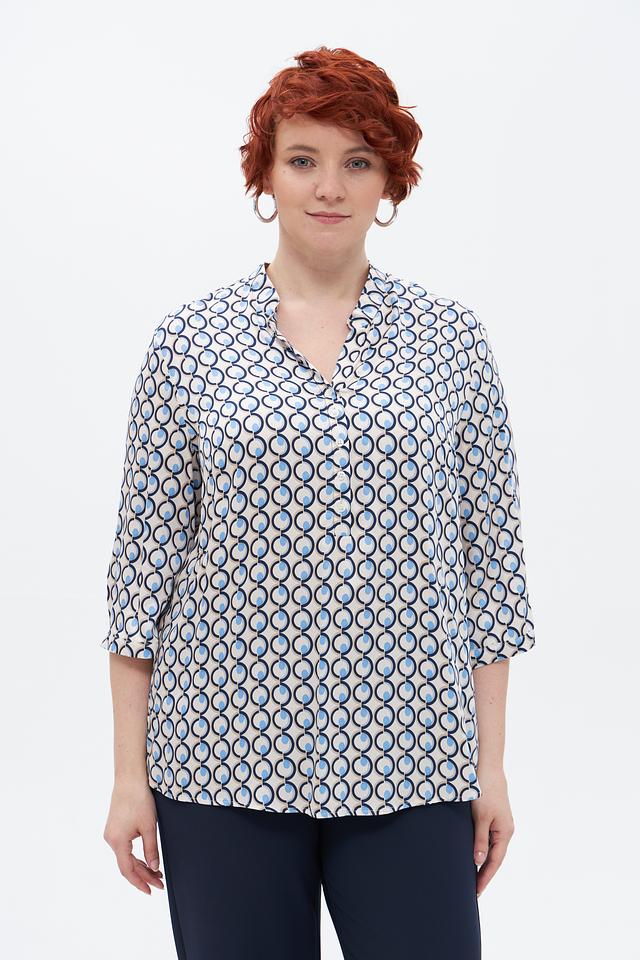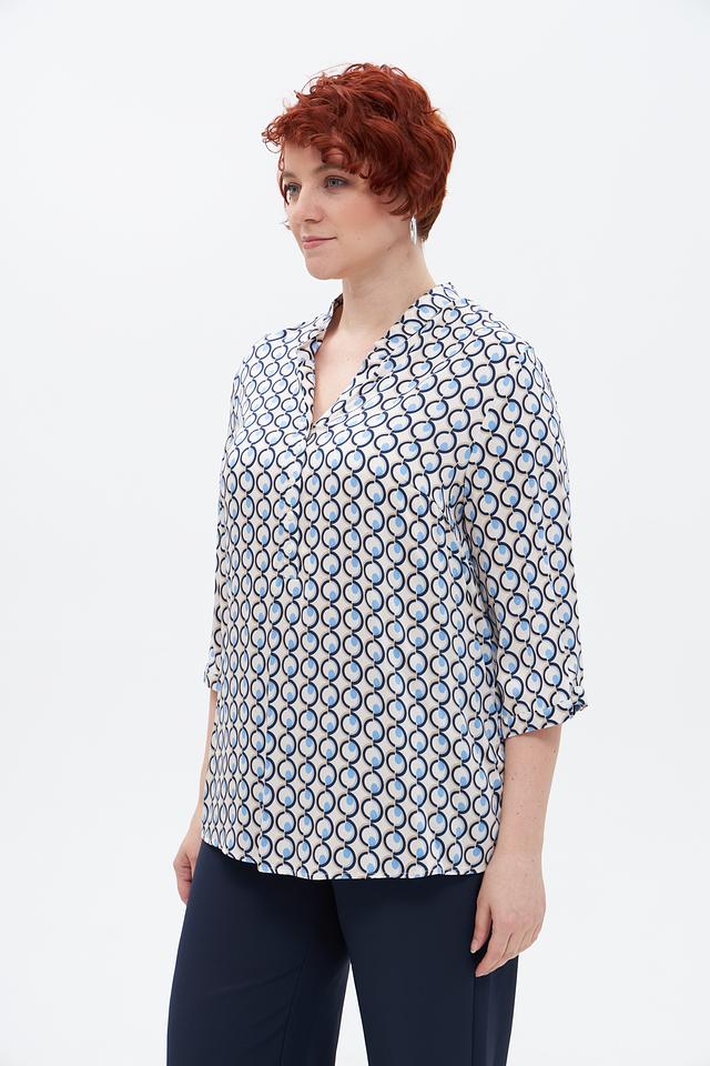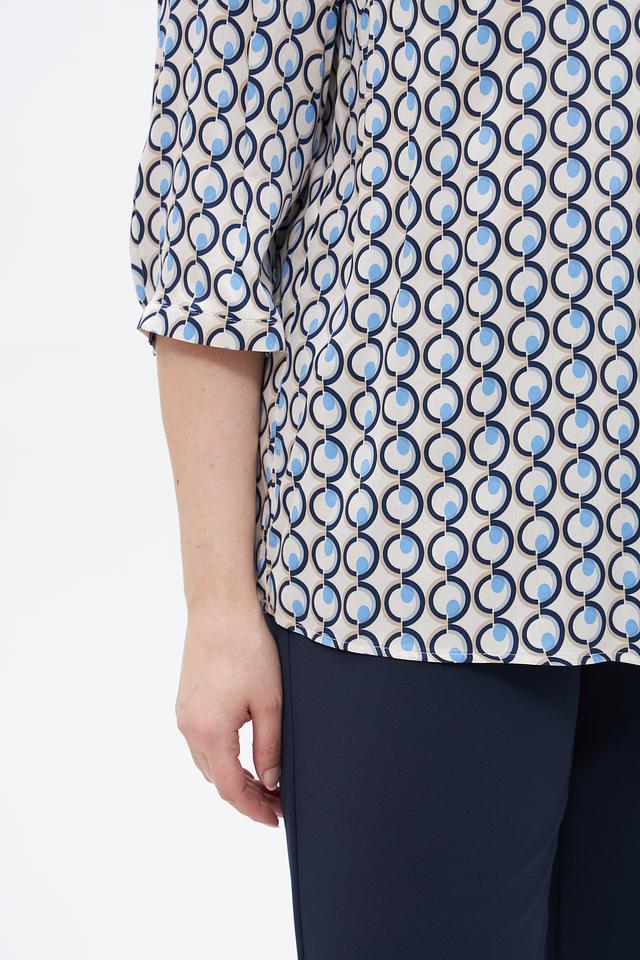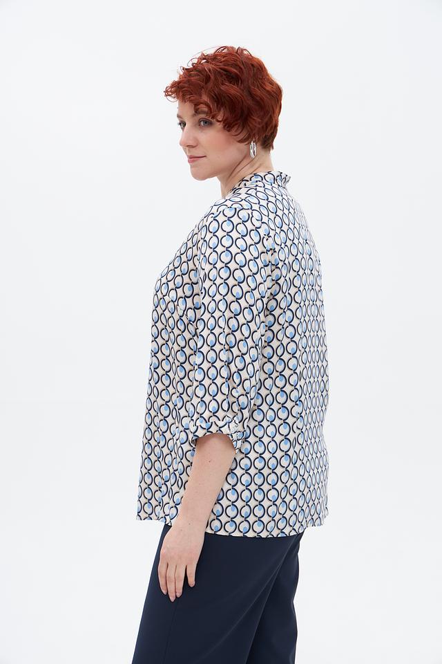 Особенностью этой модели является яркий геометрический принт, выполненный в бело-голубой гамме. Он придаёт блузе оригинальность и делает её заметной. Блуза идеально подходит для создания повседневных и офисных образов. Её можно сочетать с брюками, юбками или джинсами.