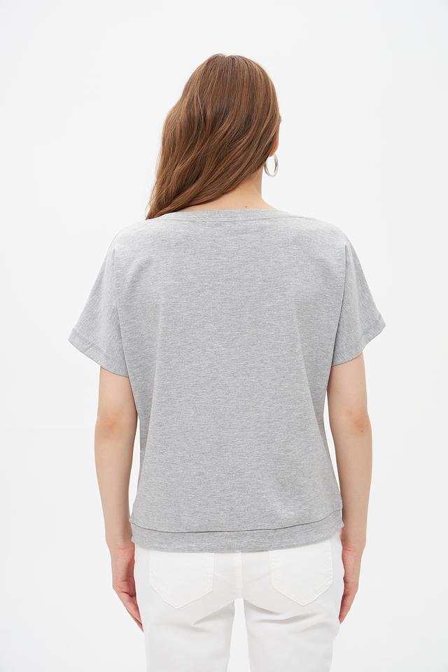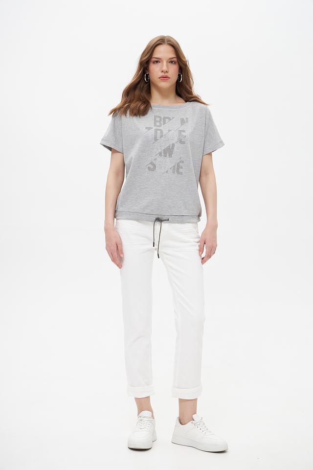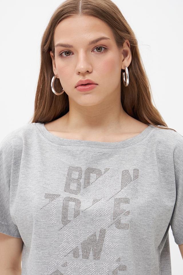 Женская футболка Suza серого цвета, украшенная стразами, выполнена из мягкого трикотажа. Состав: вискоза, полиамид, эластан. Состав: вискоза 60%, полиамид 35%, эластан 5%