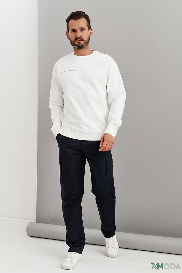Модель имеет прямой крой, круглый вырез горловины и длинные рукава с манжетами. На груди и спине расположен фирменный логотип бренда, выполненный в контрастном черном цвете, что придает джемперу особый шарм.