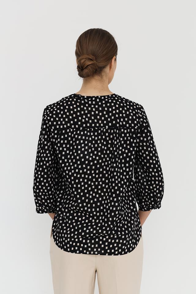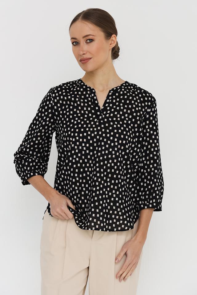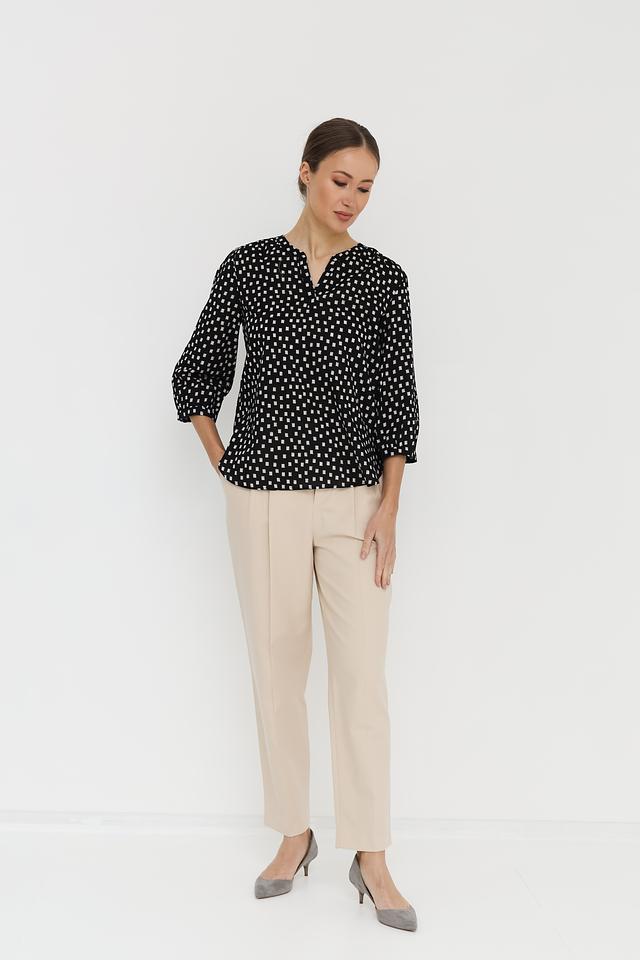 Особенностью данной модели является стильный принт в виде мелкого геометрического узора, сочетающего в себе чёрный и белый цвета. Эта блуза идеально подходит для создания как повседневных, так и более нарядных образов. Она хорошо сочетается с брюками, юбками и джинсами.
