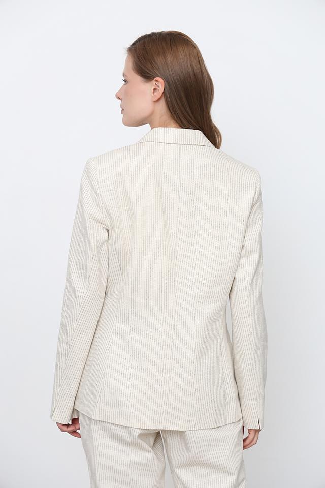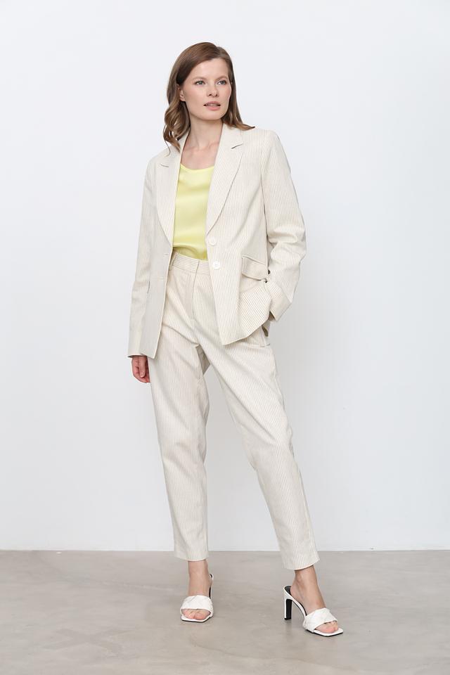 Жакет имеет классический крой с лацканами, застегивается на две пуговицы. Длинные рукава и удобные карманы делают его практичным и функциональным. Благодаря составу из хлопка и льна, жакет приятен к телу и хорошо пропускает воздух.