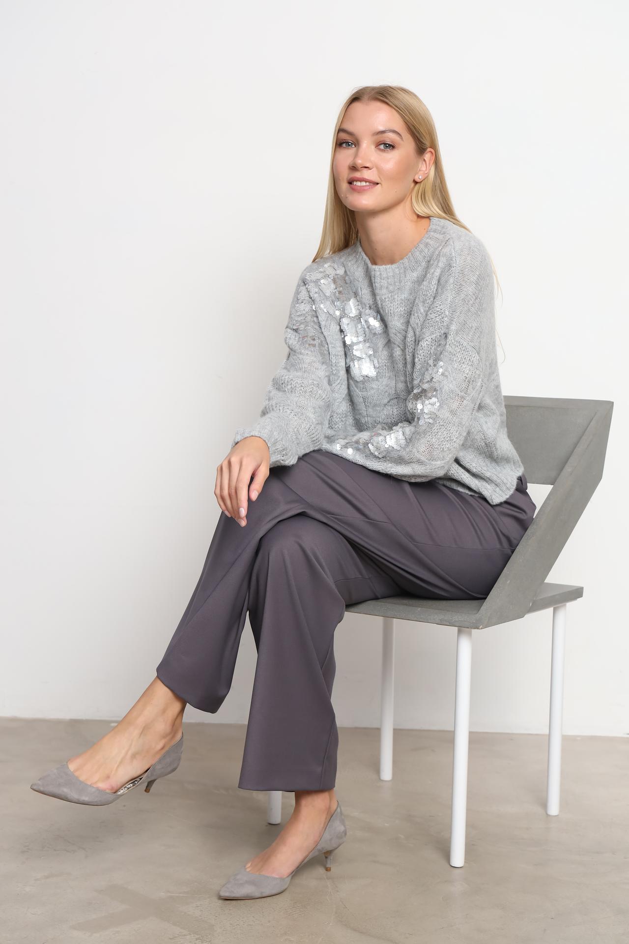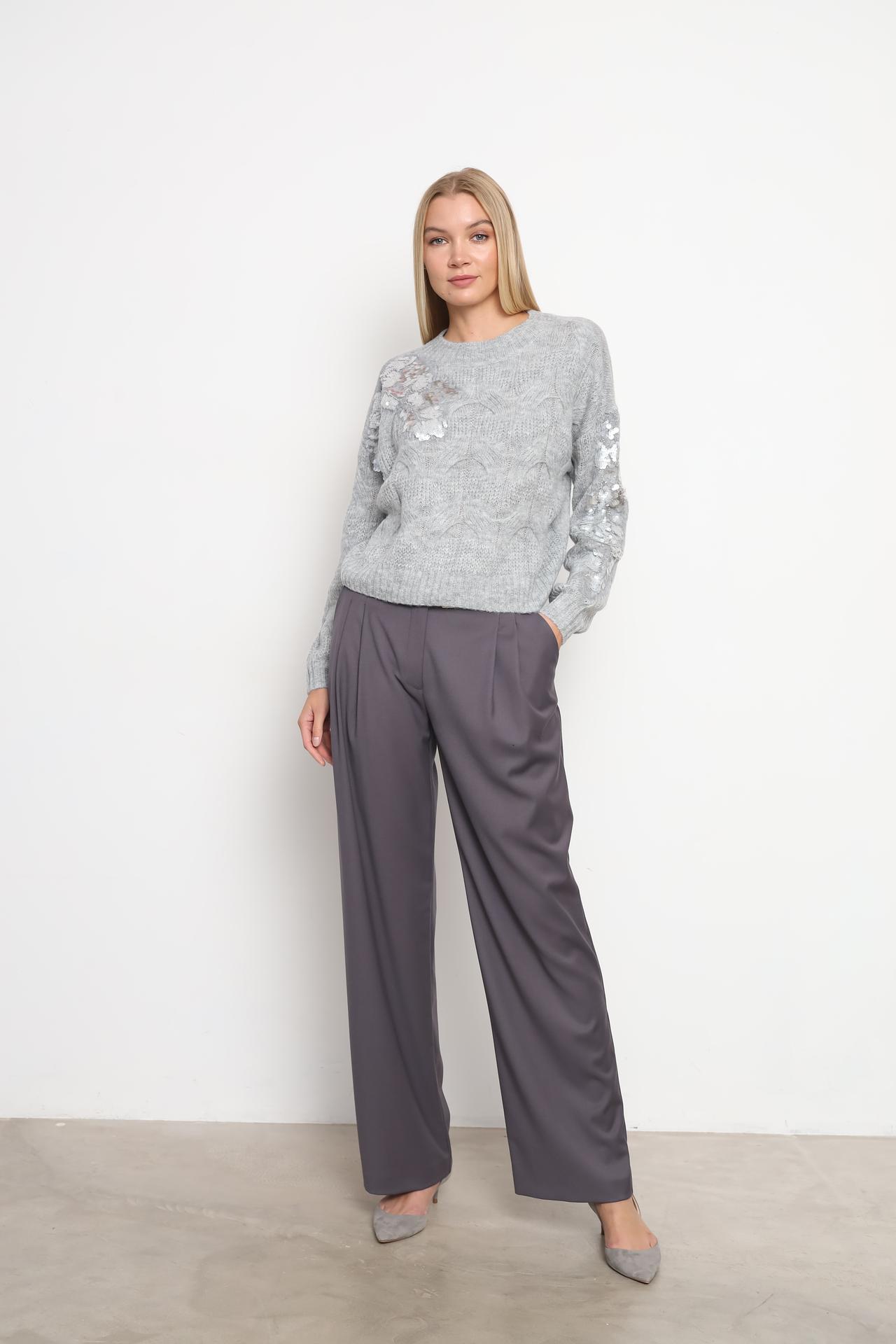 - Дизайн: Классический прямой крой с круглым вырезом горловины и длинными рукавами. Оригинальные декоративные элементы в виде пайеток и сложный узор вязки делают модель уникальной.