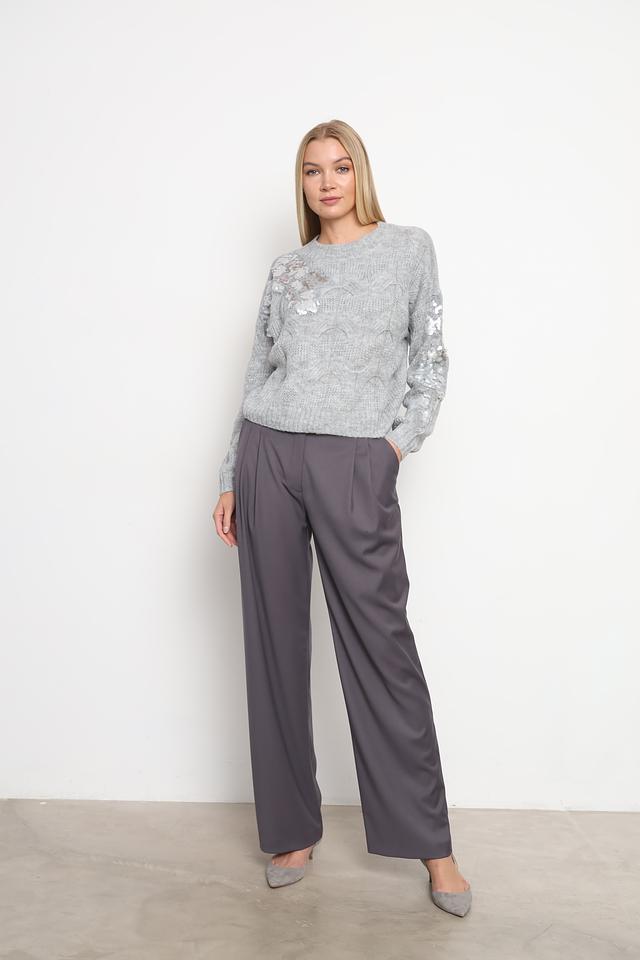 Модель имеет классический крой с круглым вырезом горловины и длинными рукавами. Особый акцент сделан на декоративные элементы – пайетки, которые расположены на плечах и рукавах, придавая изделию праздничный вид. Узор "косы" добавляет текстуры и объема.