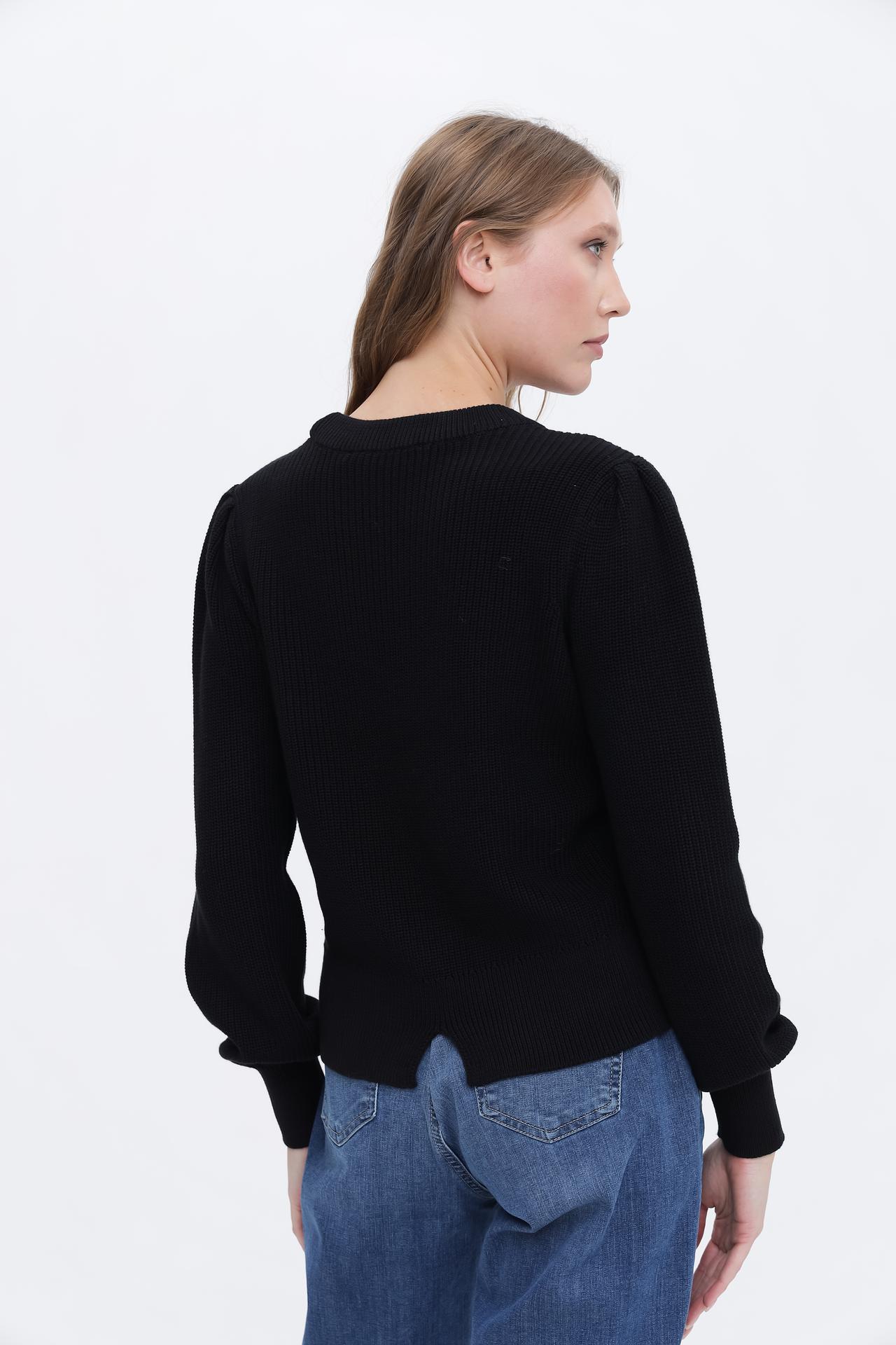 - Дизайн: Модель отличается лаконичным круглым вырезом и длинными рукавами. Небольшие декоративные вставки в виде V-образного узора на груди и объемные рукава придают изделию изысканность и актуальность.