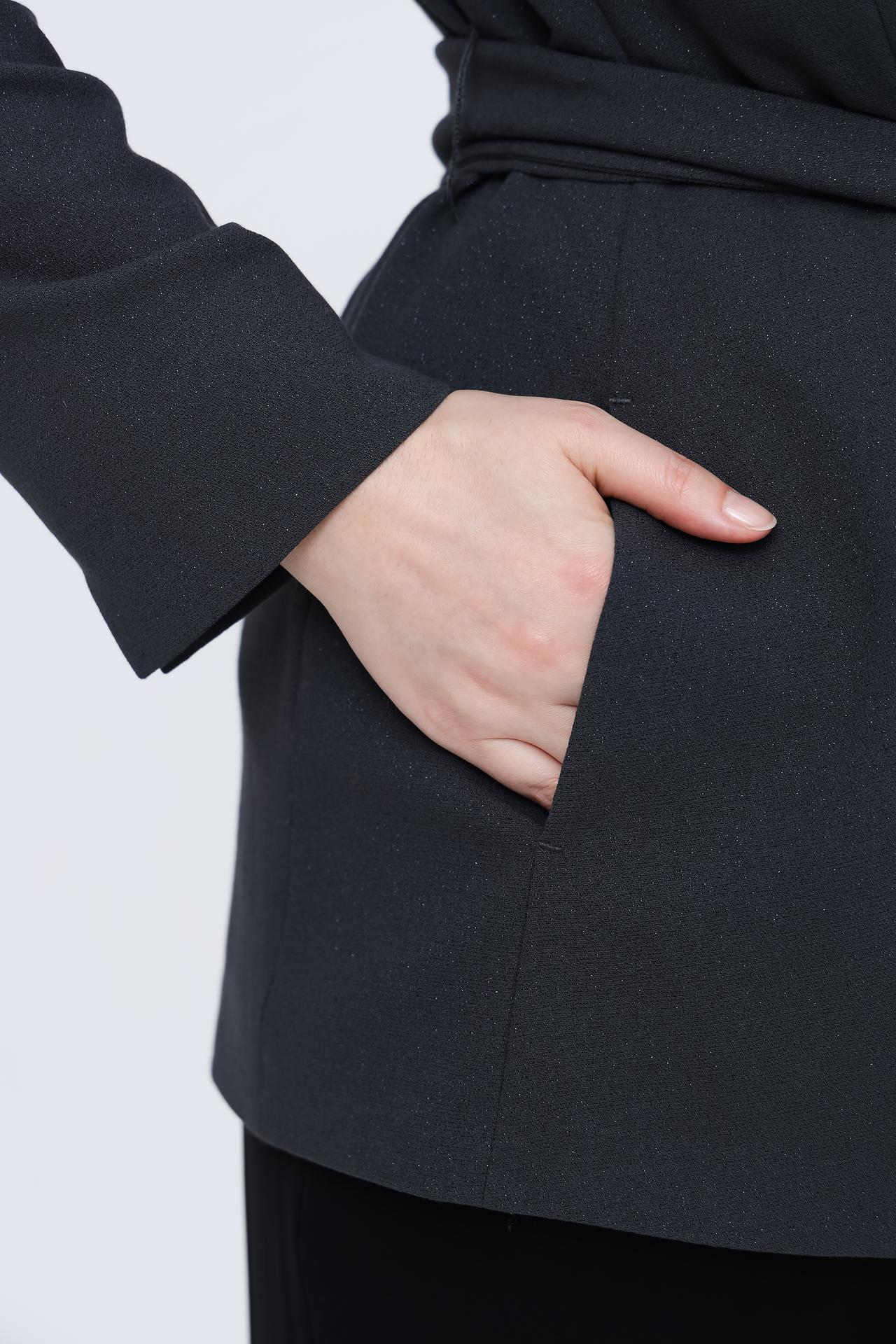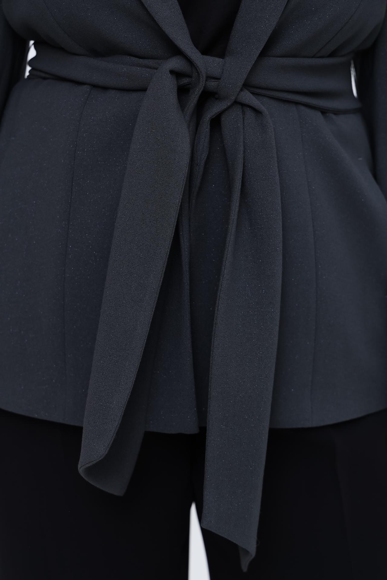 - Дизайн: Приталенный крой с поясом на талии. Жакет застегивается на узел, создавая элегантный образ. Классический воротник и длинные рукава добавляют изделию элегантности.