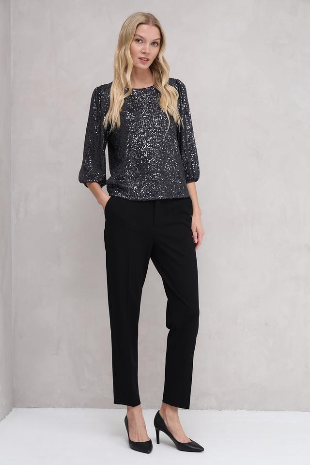Блуза полностью покрыта мерцающими пайетками, которые создают эффектный блеск и привлекают внимание. Округлый вырез горловины и рукава длиной 3/4 придают модели элегантность и женственность. Свободный крой обеспечивает свободу движений и позволяет создать расслабленный, но при этом изысканный силуэт.