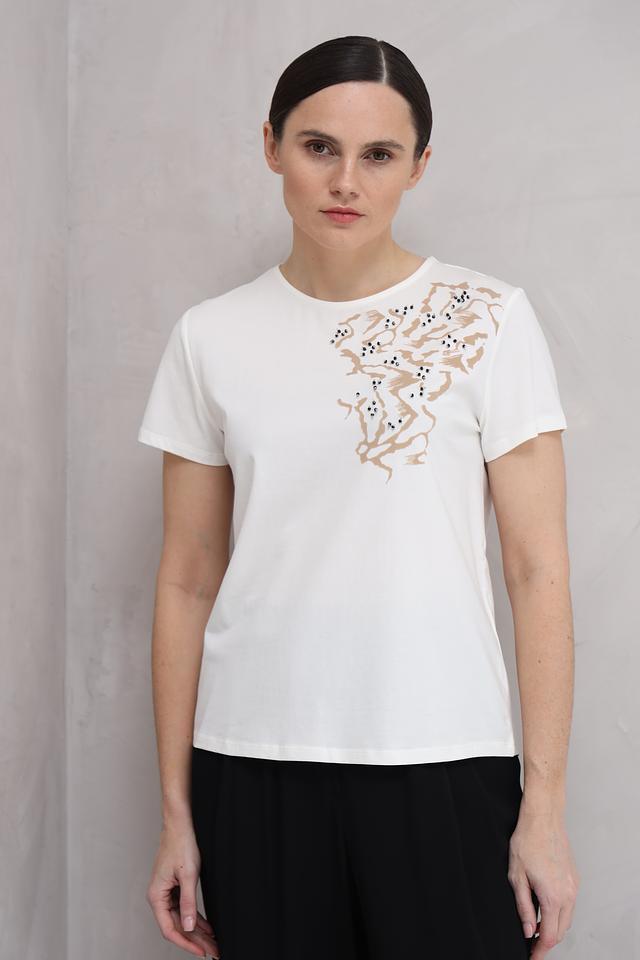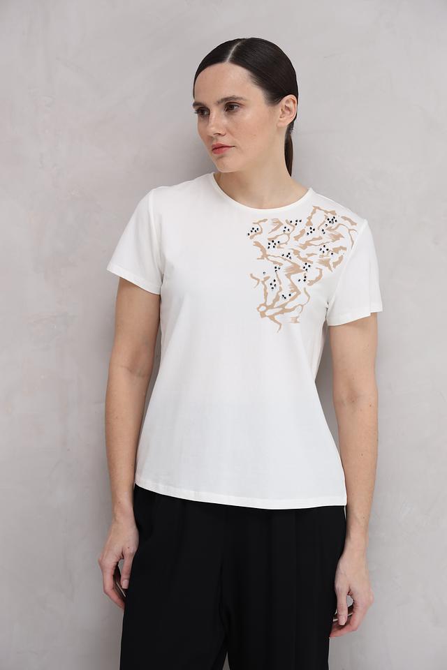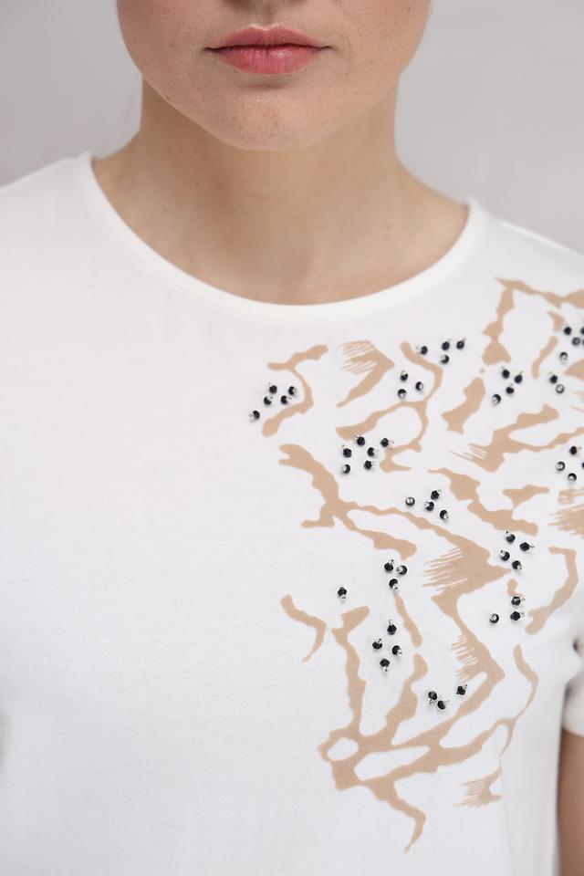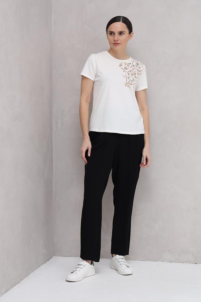 Особенностью данной модели является оригинальная вышивка в бежево-коричневых тонах, которая придает футболке неповторимый стиль и изысканность. Прямой крой футболки позволяет ей хорошо сочетаться с различными элементами одежды, а короткий рукав делает ее идеальным выбором для теплой погоды.