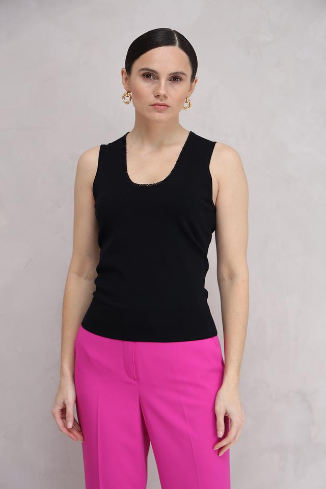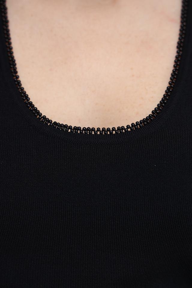 Тонкие бретели и приталенный силуэт подчеркивают фигуру, а отделка горловины из бисера добавляет изысканности и оригинальности. Топ прекрасно сочетается с джинсами, брюками, юбками и шортами.