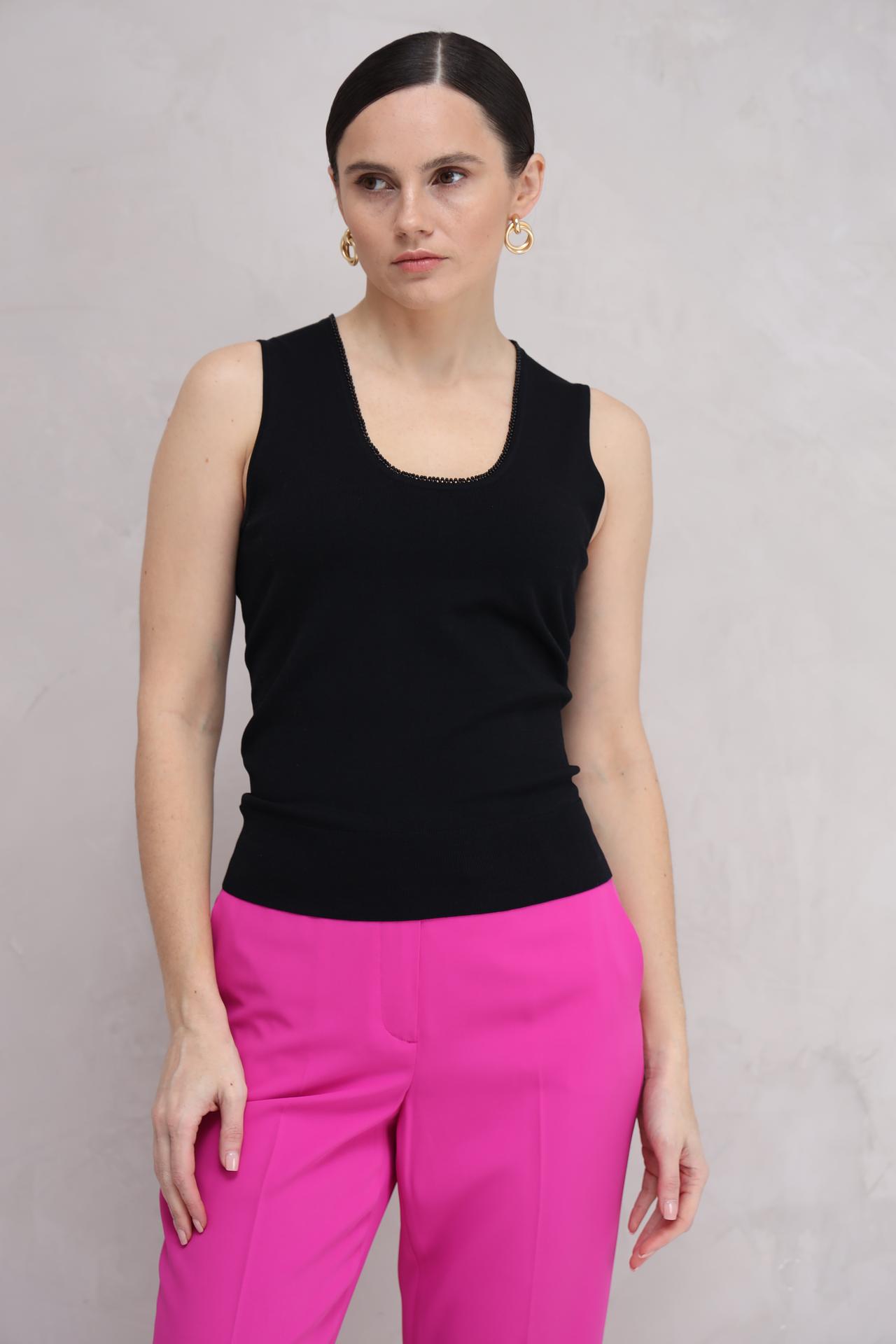 Классический чёрный топ от Taifun – идеальное дополнение к вашему гардеробу. Этот топ легко сочетается с различными предметами одежды, от элегантных брюк до джинсов, создавая стильные образы на каждый день. Декоративная отделка по вырезу горловины добавляет изысканности и женственности, делая этот топ особенным.