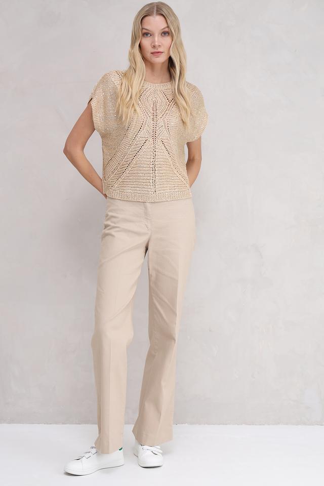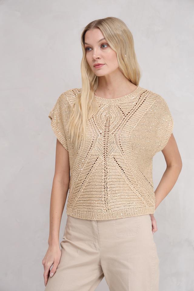 Бежевый пуловер от Taifun с коротким рукавом и ажурной вставкой на горловине и переде. Модель выполнена из мягкого трикотажа с добавлением металлизированных волокон, что придает изделию легкий блеск. Состав: полиакрил 57%, полиэстер 40%, металлизир. волокно 3%