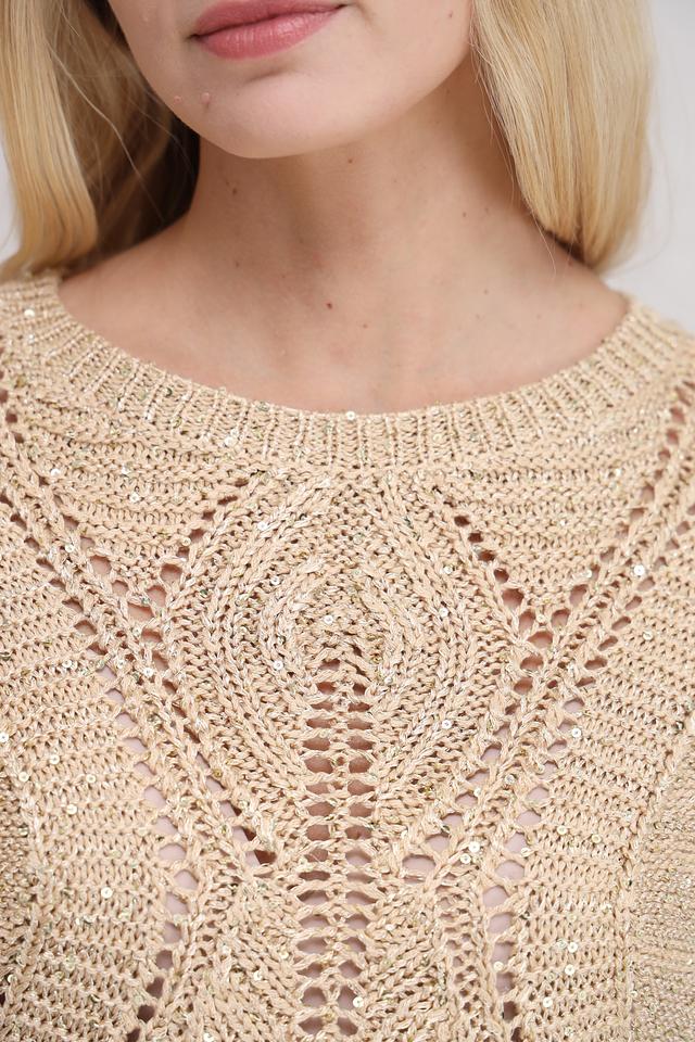 Пуловер имеет короткий рукав и свободный крой, что обеспечивает свободу движений. Ажурная вставка на горловине и переде придает изделию оригинальность и легкость. Бежевый цвет делает его универсальным и подходящим для создания различных образов.