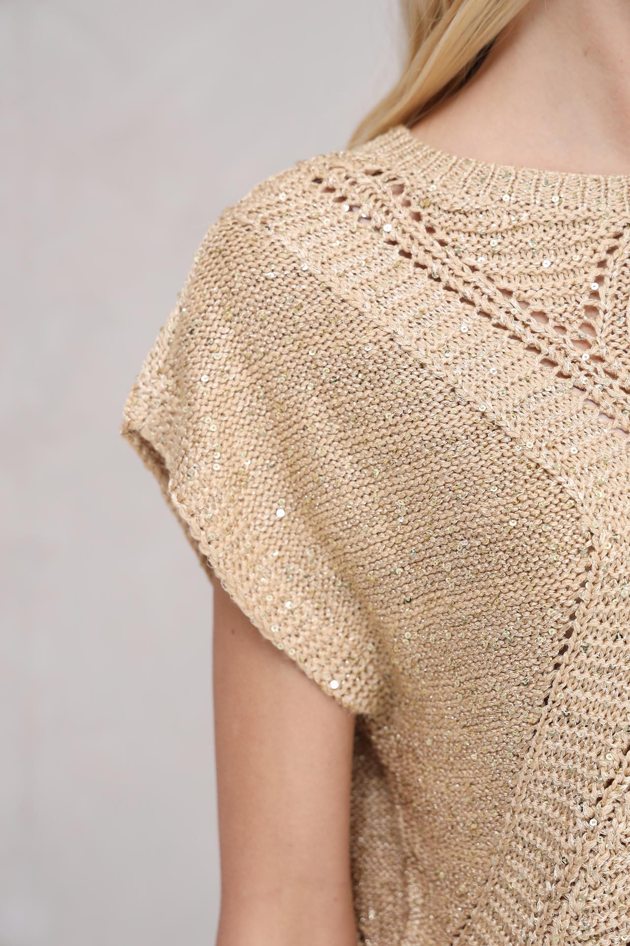 Короткий крой и короткие рукава делают его идеальным вариантом для теплой погоды. Металлизированные волокна добавляют изделию мерцание, делая его особенно нарядным.