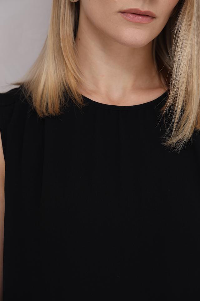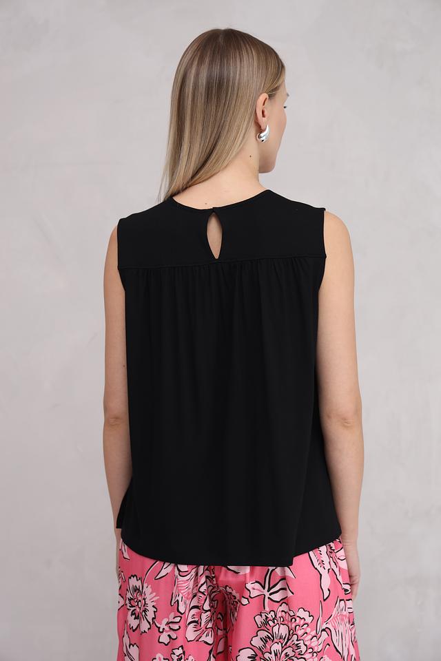 Топ имеет прямой крой и небольшие плечи, что придает ему элегантный вид. Круглый вырез горловины и отсутствие рукавов делают его идеальным для теплой погоды.