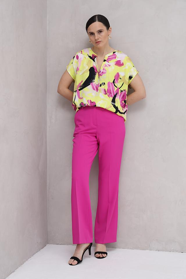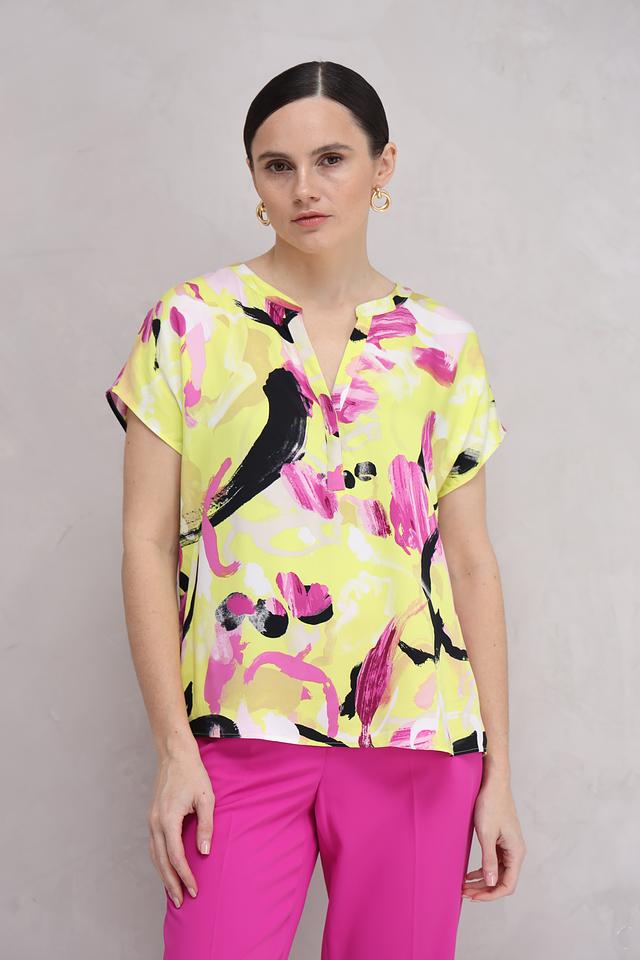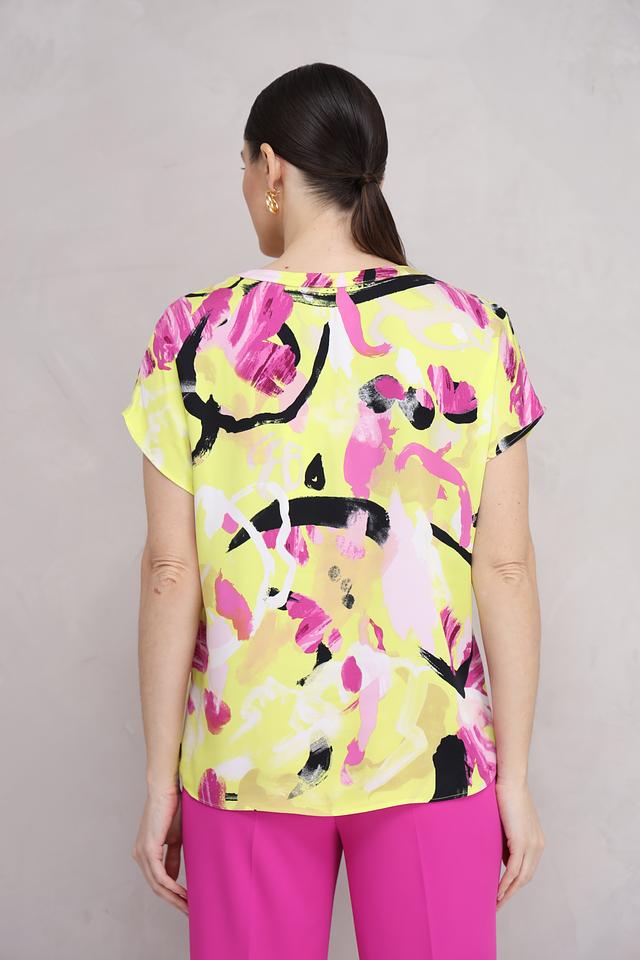 Особенностью данной модели является оригинальный абстрактный принт, сочетающий в себе жёлтый, розовый и чёрный цвета. V-образный вырез горловины и короткие рукава придают блузе лёгкость и женственность.