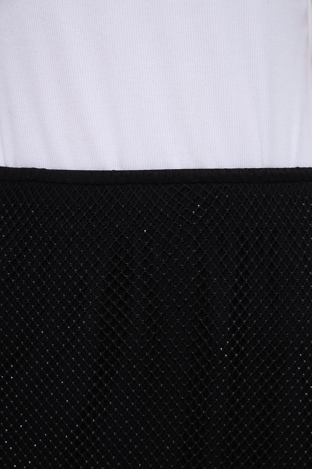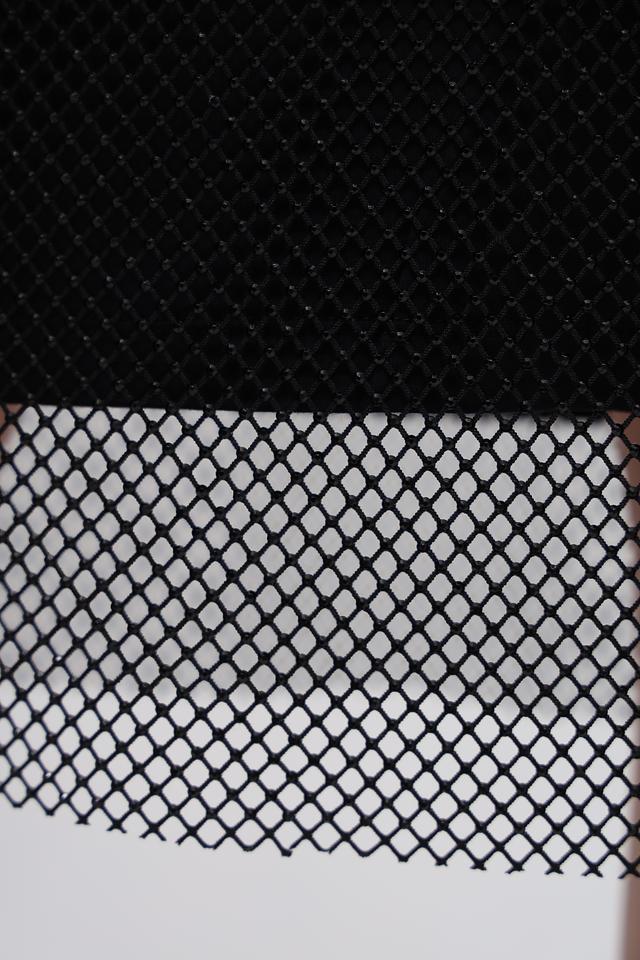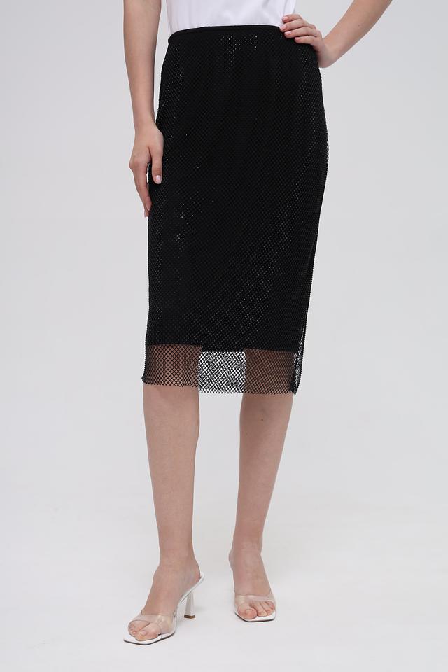 Юбка имеет классическую длину миди и приталенный силуэт, который подчеркивает фигуру. Верхняя часть юбки выполнена из ткани с рельефной текстурой, напоминающей мелкую сетку. Нижняя часть юбки – полупрозрачная сетка, создающая эффект многослойности и добавляющая образу воздушности.