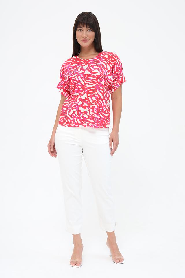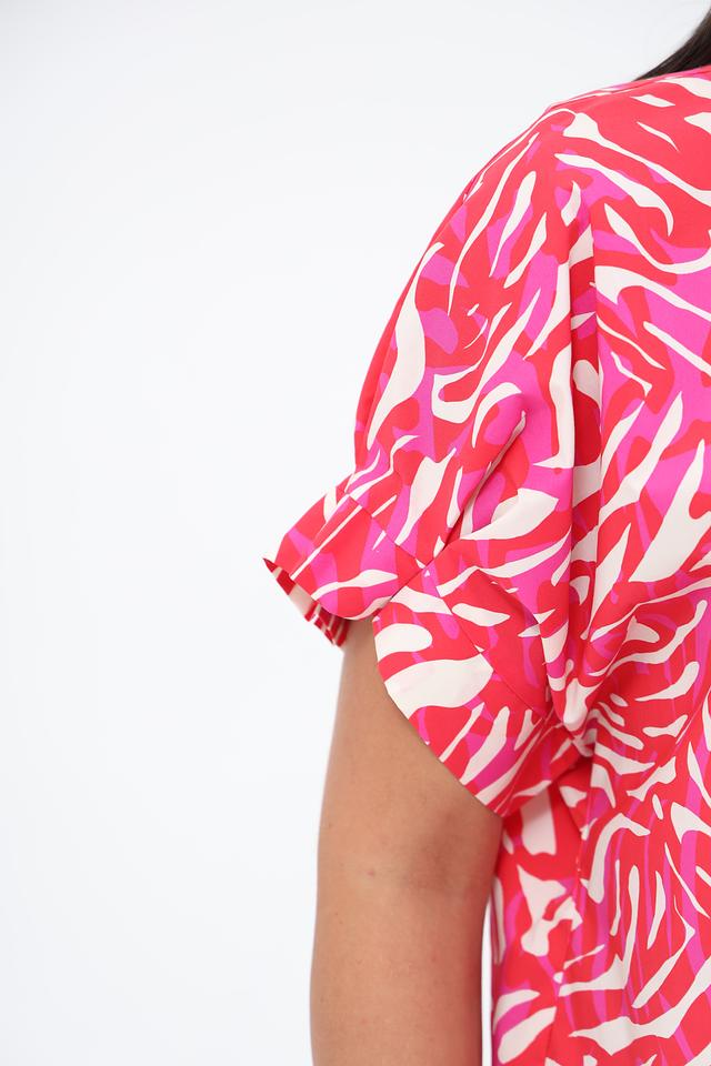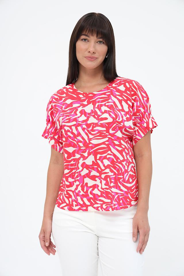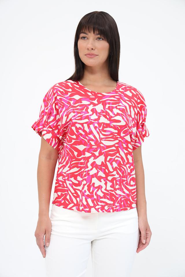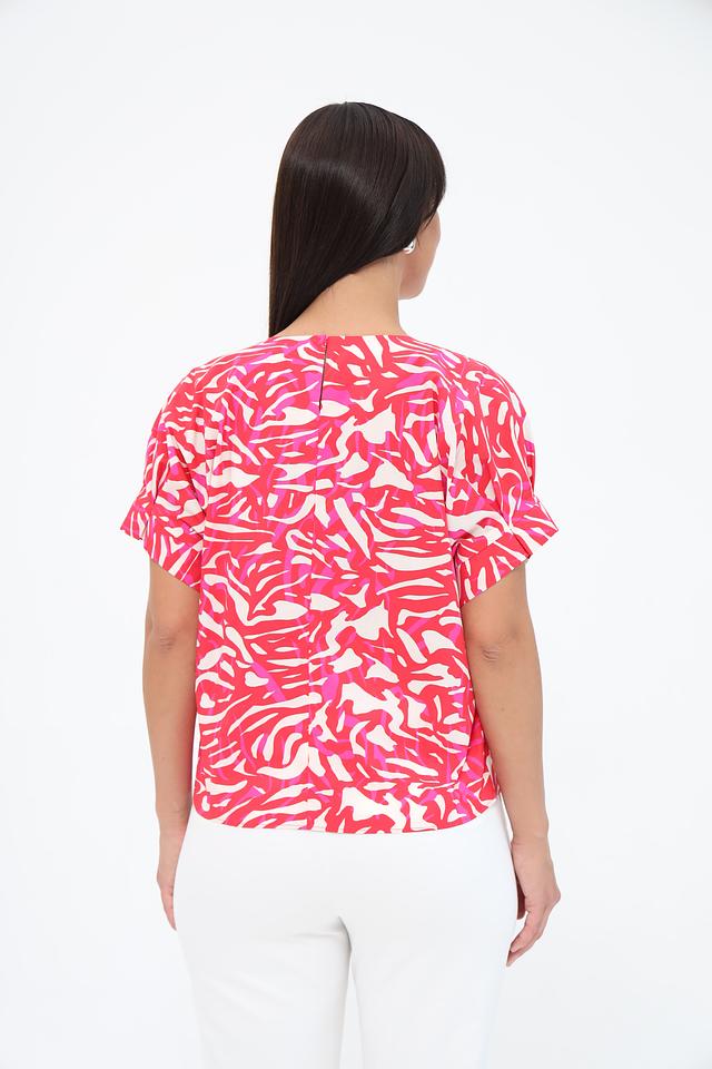Блуза имеет свободный крой, который не сковывает движений и позволяет коже дышать. Округлый вырез горловины и короткие рукава с небольшими воланами придают модели женственность и лёгкость. Привлекательный абстрактный принт в розовых тонах делает эту блузу уникальной и стильной.