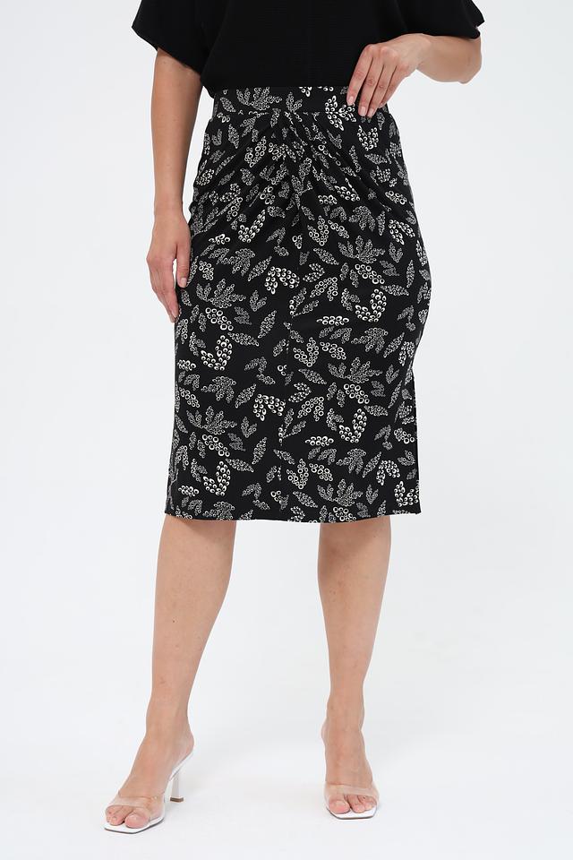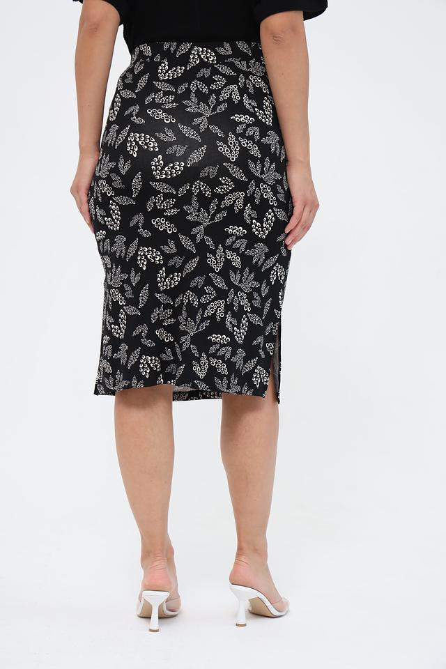 Юбка имеет классическую длину миди и облегающий силуэт, подчеркивающий достоинства фигуры. Особенностью модели является стильный цветочный принт, который добавляет образу женственности и изысканности. Небольшой разрез сзади обеспечивает свободу движений.