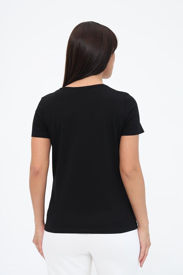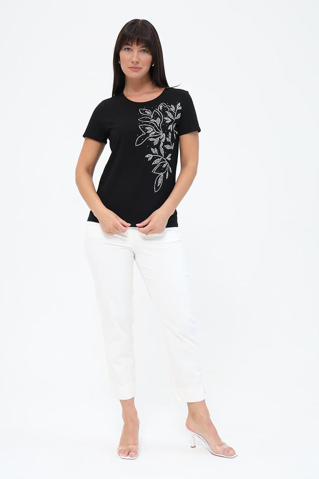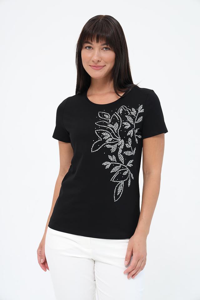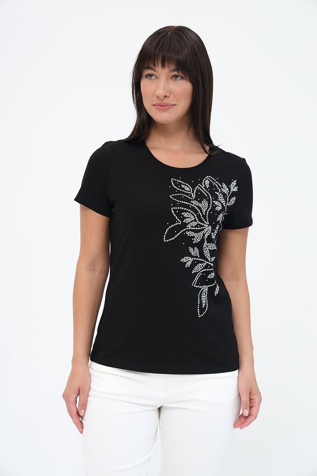 Основной цвет футболки – чёрный, который легко сочетается с любым гардеробом. Главная особенность модели – эффектный декор из страз, выполненный в виде цветочного узора на левой стороне. Этот декор придает футболке изысканность и делает её отличным вариантом для особых случаев или для тех, кто любит добавлять в свой образ немного блеска.