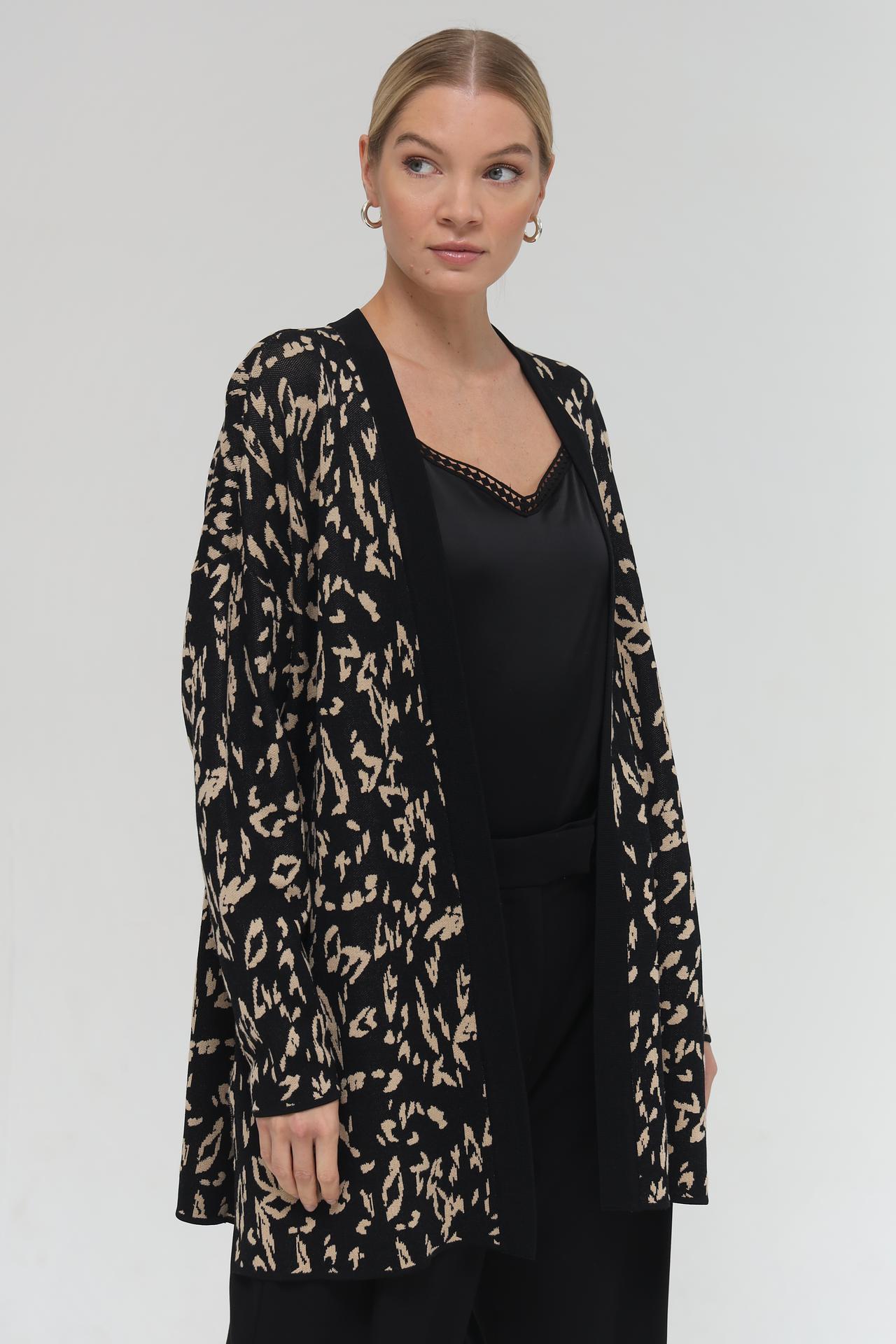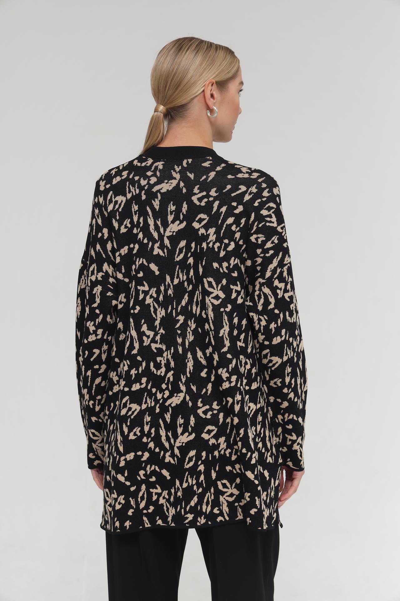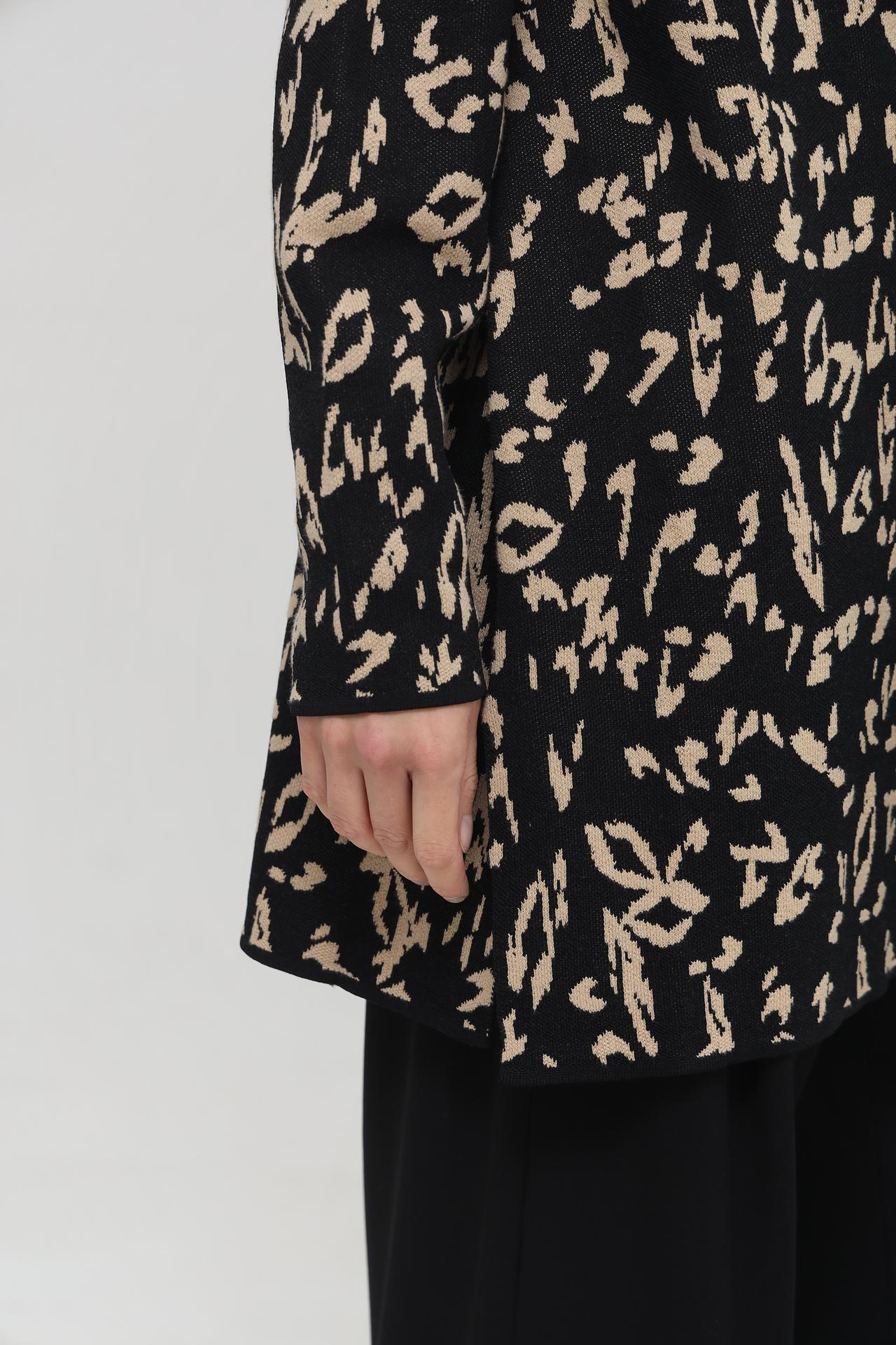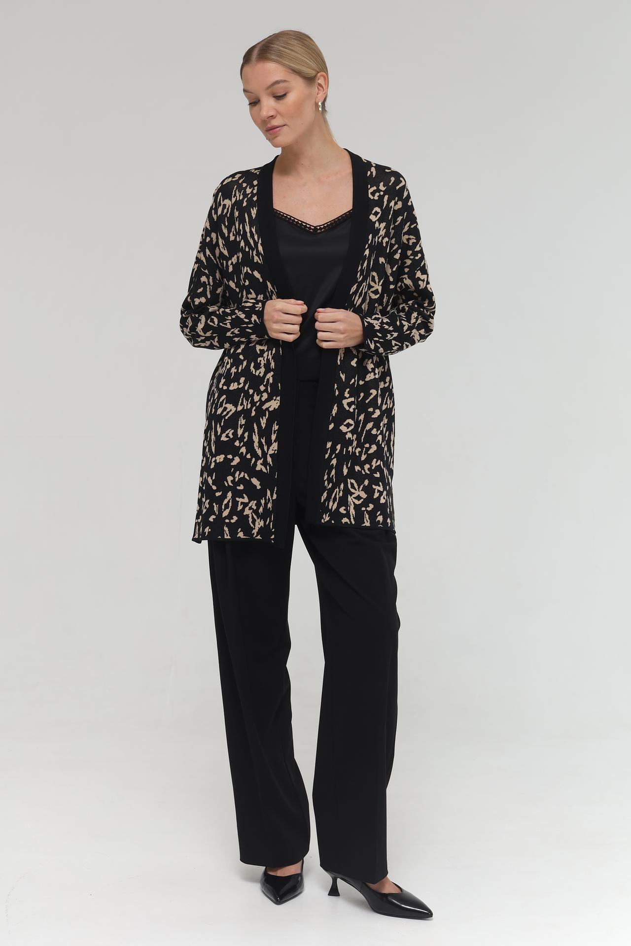 - Дизайн: Анималистичный принт в сочетании черного и бежевого цветов придает жакету выразительность и современный вид. Отсутствие застежки и классический крой рукава подчеркивают элегантность модели.
