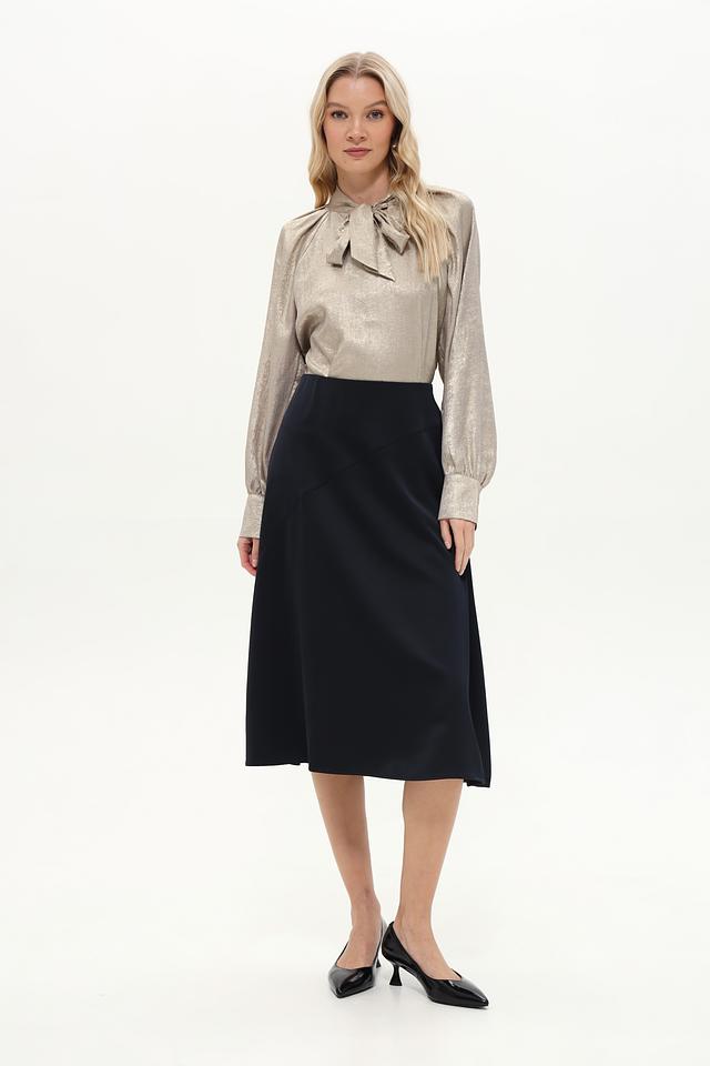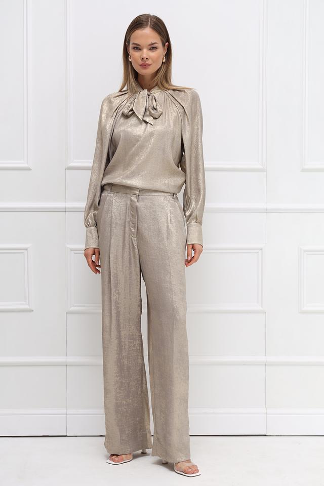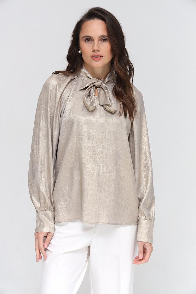 Блуза имеет длинные рукава и свободный крой, обеспечивающий комфорт при носке. Особый акцент сделан на декоративный бант на горловине, который добавляет образу романтичности.