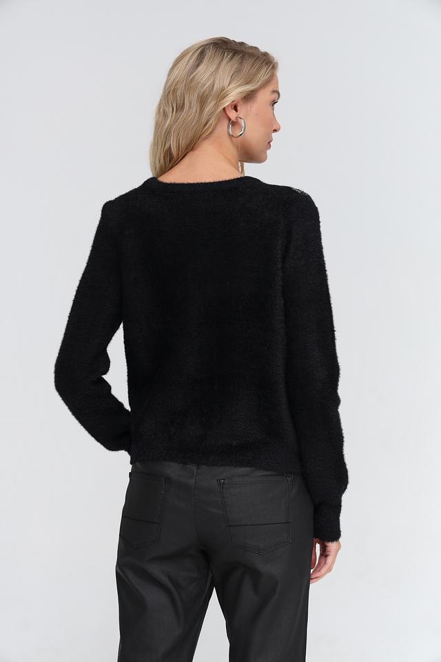 Пуловер имеет удобный крой и круглый вырез горловины. Мягкая и приятная на ощупь ткань, состоящая из полиамида, вискозы и полиэстера, обеспечивает комфорт при ношении. Небольшое добавление металлизированной нити придает изделию деликатный блеск и делает его более интересным.