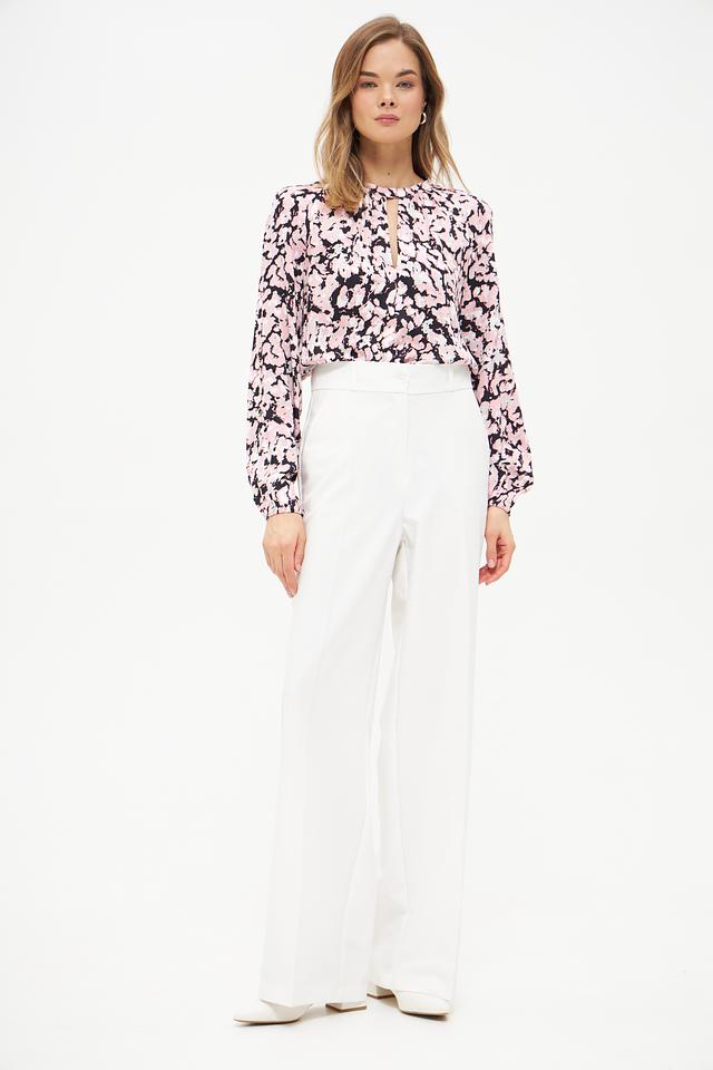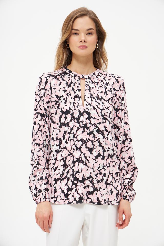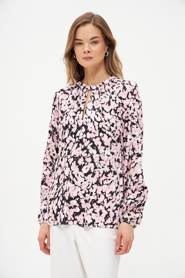 Блуза имеет нежно-розовый цвет с изысканным цветочным принтом, который придает ей романтичный и женственный вид. Вырез горловины дополнен небольшим разрезом, что добавляет образу легкости и оригинальности.