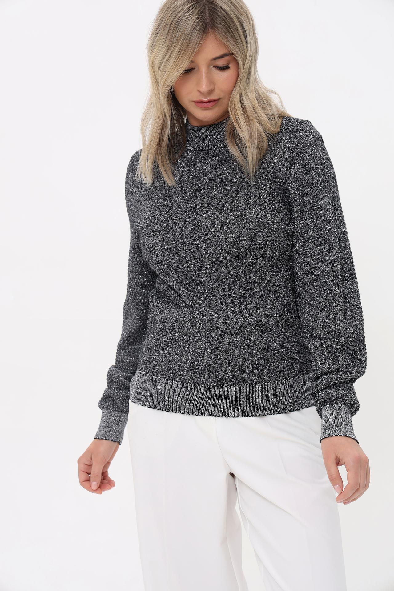 Элегантный пуловер Taifun станет идеальным дополнением к вашему гардеробу. Благодаря уникальному плетению и деликатному блеску метализированной нити, он придает образу изысканность и утонченность. Модель с высоким воротником-стойкой и длинными рукавами обеспечивает комфорт и тепло, а приятная на ощупь ткань дарит ощущение роскоши.