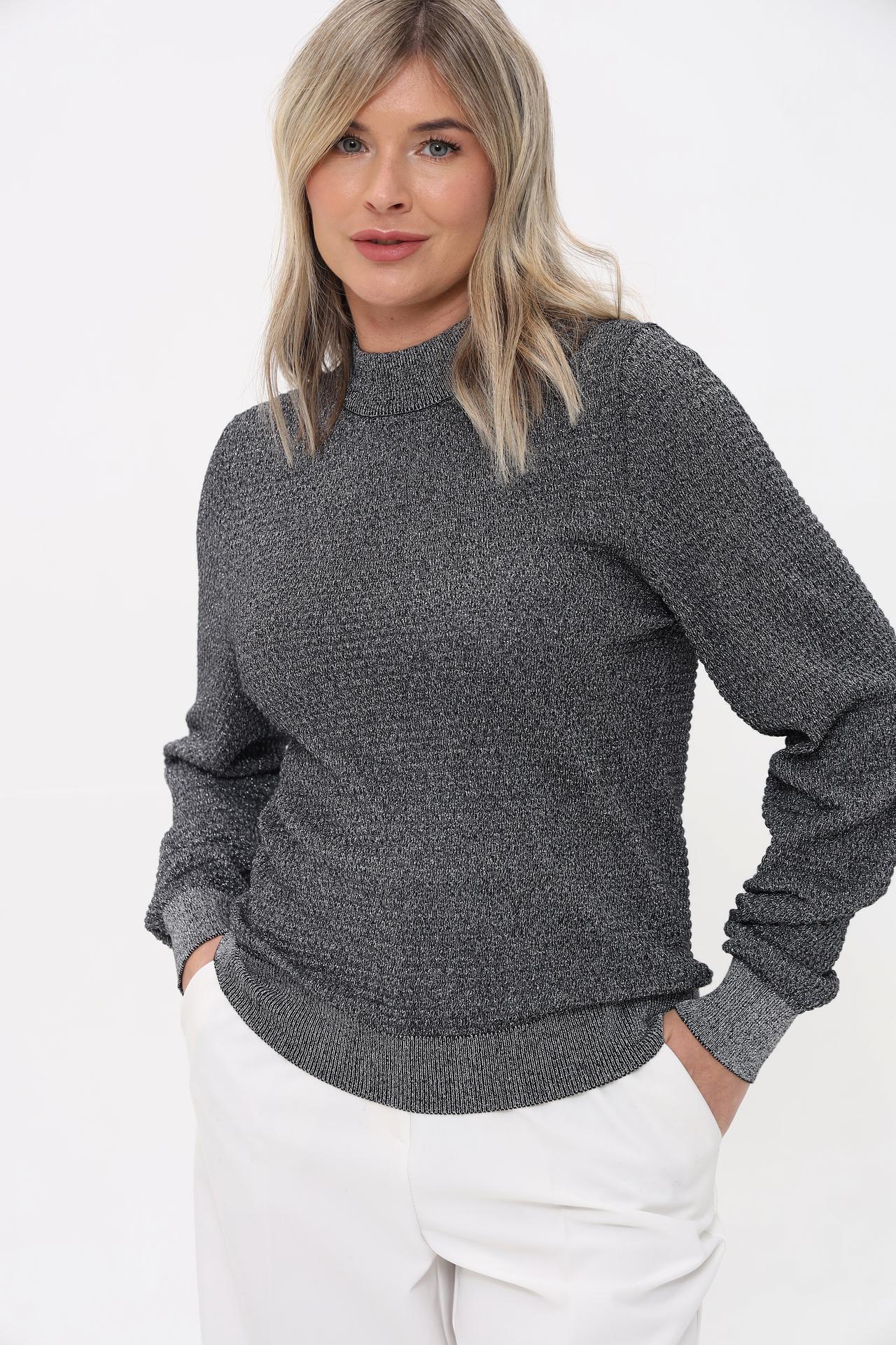 - Дизайн: Классический крой с высоким воротником и длинными рукавами, дополненный фактурной вязкой и деликатным мерцанием.